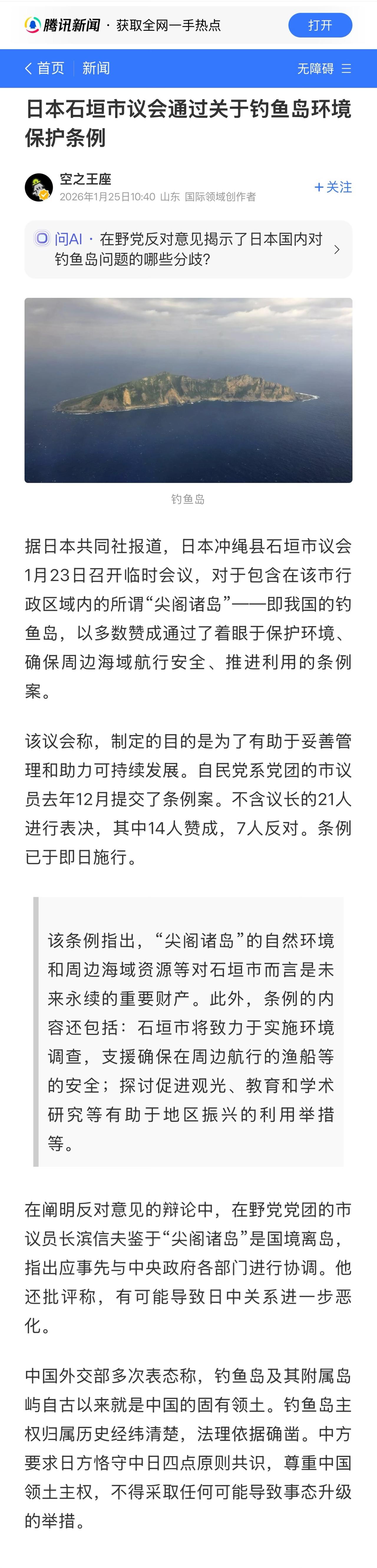 日本共同社昨晚(1月24日晚)报道:日本冲绳县石垣市议会星期五(1月23日)以多