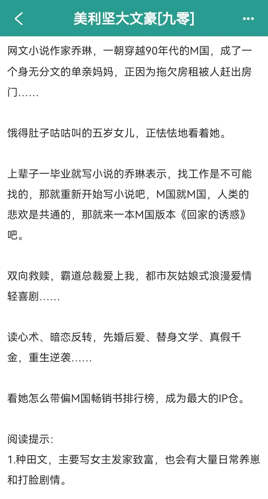 美利坚大文豪[九零]。每日好文推荐 创作者中心 创作灵感 作者PS阅读提示: 1.种田文,主要写女主发家致富,也会有大量日常养崽和打脸剧情。 2.文中文,非文抄公。