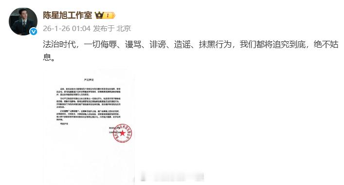 陈星旭工作室声明陈星旭工作室已取证 “法治时代,一切侮辱、谩骂、诽谤、造谣、抹黑行为,我们都将追究到底,绝不姑息。 ”