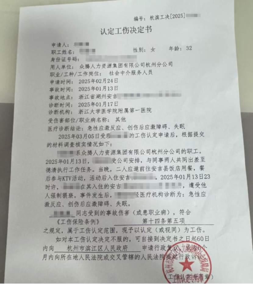 杭州33岁女子出差遭客户猥亵!职场女性出差=默认同意陪酒陪玩? 2026年1月,杭州一起劳动争议案开庭,核心是员工刘慧出差时遭客户猥亵导致精神损伤,虽被认定为工伤,但与公司的纠纷仍未解决。 2025年初,刘慧在出差应酬后,被客户潜入房间强制猥亵,施害者已获刑。此事件导致她患上严重创伤后应激障碍。依据类似判例,当地人社局将此精神损伤认定为工伤,成为法律实践的一次进步。 然而,刘慧所在公司的态度令她遭受二次伤害:事发后曾要求她主动辞职,拒绝病假申请,即使在工伤认定后,仍不认可其完整的停工留薪期待遇,并拒绝了她提出的公开道歉要求。 案件暴露了当前制度的空白:虽然精神损伤可被认定为工伤,但后续的停工留薪期、康复标准等缺乏具体规定,导致“认定易,落实难”。精神类工伤在现行分类目录中几乎无据可依。 此事折射出需频繁应酬、出差的职场人,尤其是女性面临的普遍风险。它促使社会反思畸形的“酒桌文化”,并呼吁企业建立真正的性骚扰防范机制和安全的职场环境。员工的尊严与安全,不应成为商业利益的代价。女员工遭性骚扰 性猥亵获工伤 酒吧性骚扰 杭州性骚扰 同事侵犯 餐厅猥亵妇女 醉酒性骚扰
