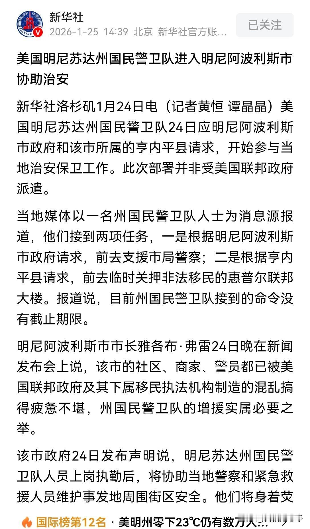 明尼苏达州的州长,以及明尼阿波利斯市的市长,看来要跟特朗普硬刚到底了。 目前明尼苏达州的国民警卫队已经在24号被部署在明尼阿波利斯市。 对外的解释是要保护整个城市的公民。 这不就是要跟ice特工作对吗? 很有可能眼下的局面正是特朗普所希望的。 他要看一看受地方州控制的国民警卫队有没有胆子对他的冲锋队开枪? 美国的军权是分裂的。 各州的州长手里面都有一支国民警卫队。 而总统手里有一支美军以及各种特工。 现在两边已经顶上牛了。 后面就看看这两派会不会开枪。 谁输谁赢呢? 咱们看看最后谁先怂。 是州立的国民警卫队呢?还是特朗普的嫡系部队呢?