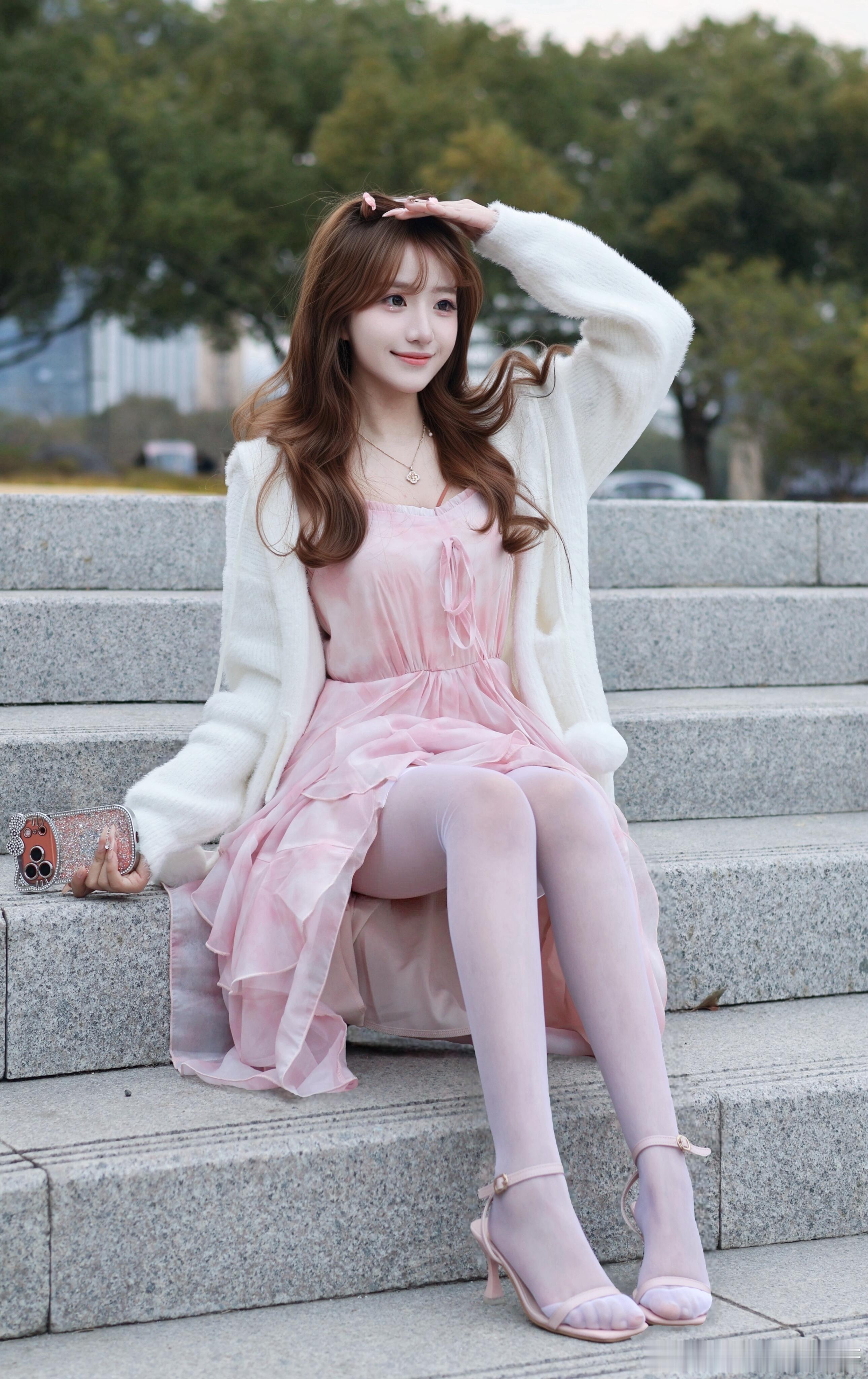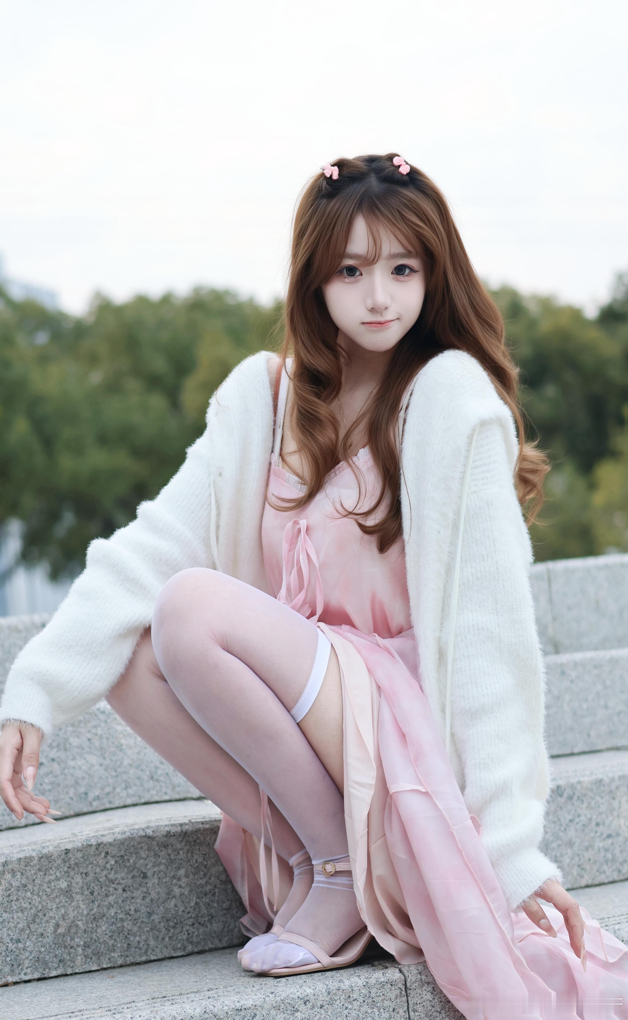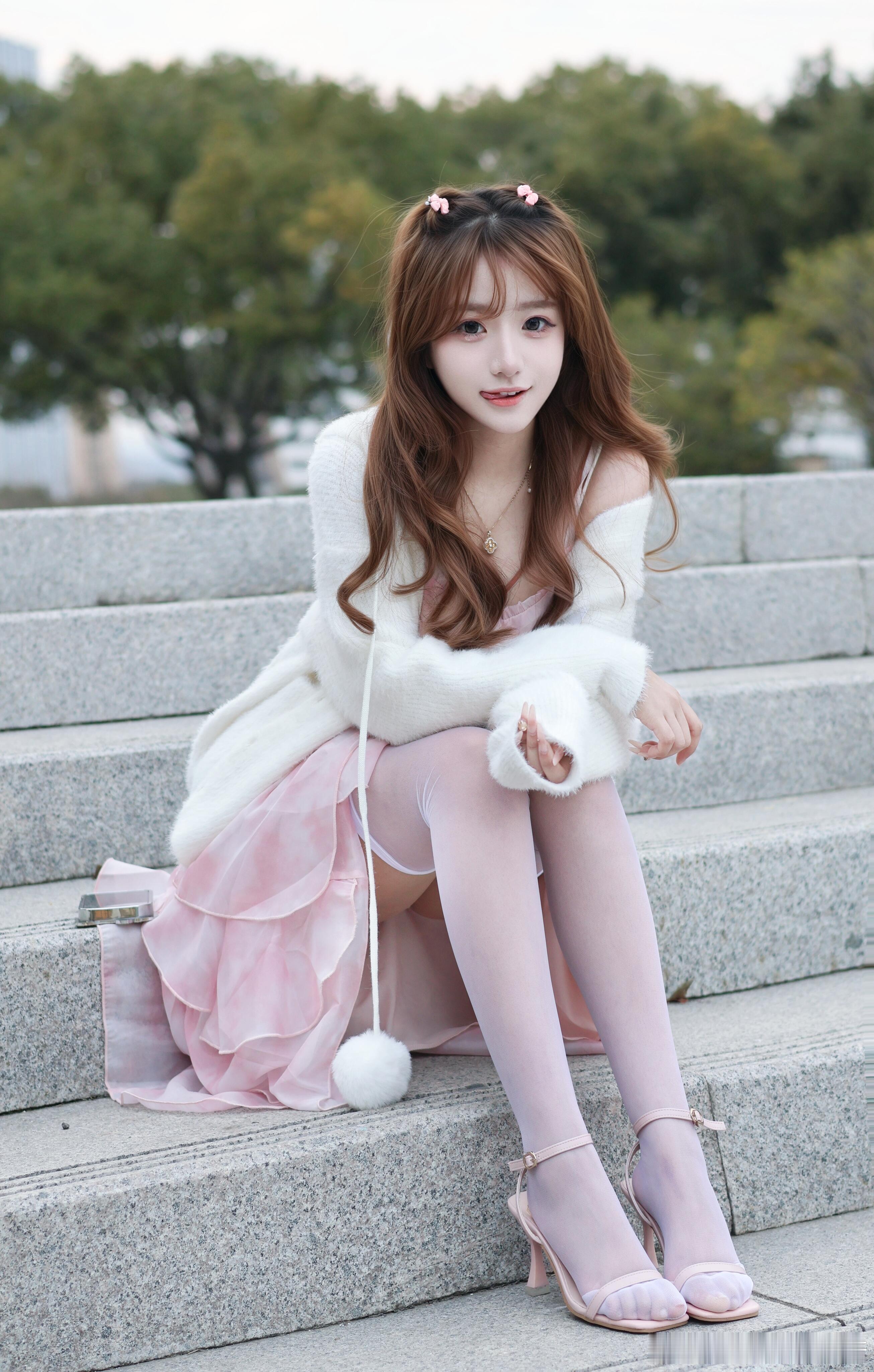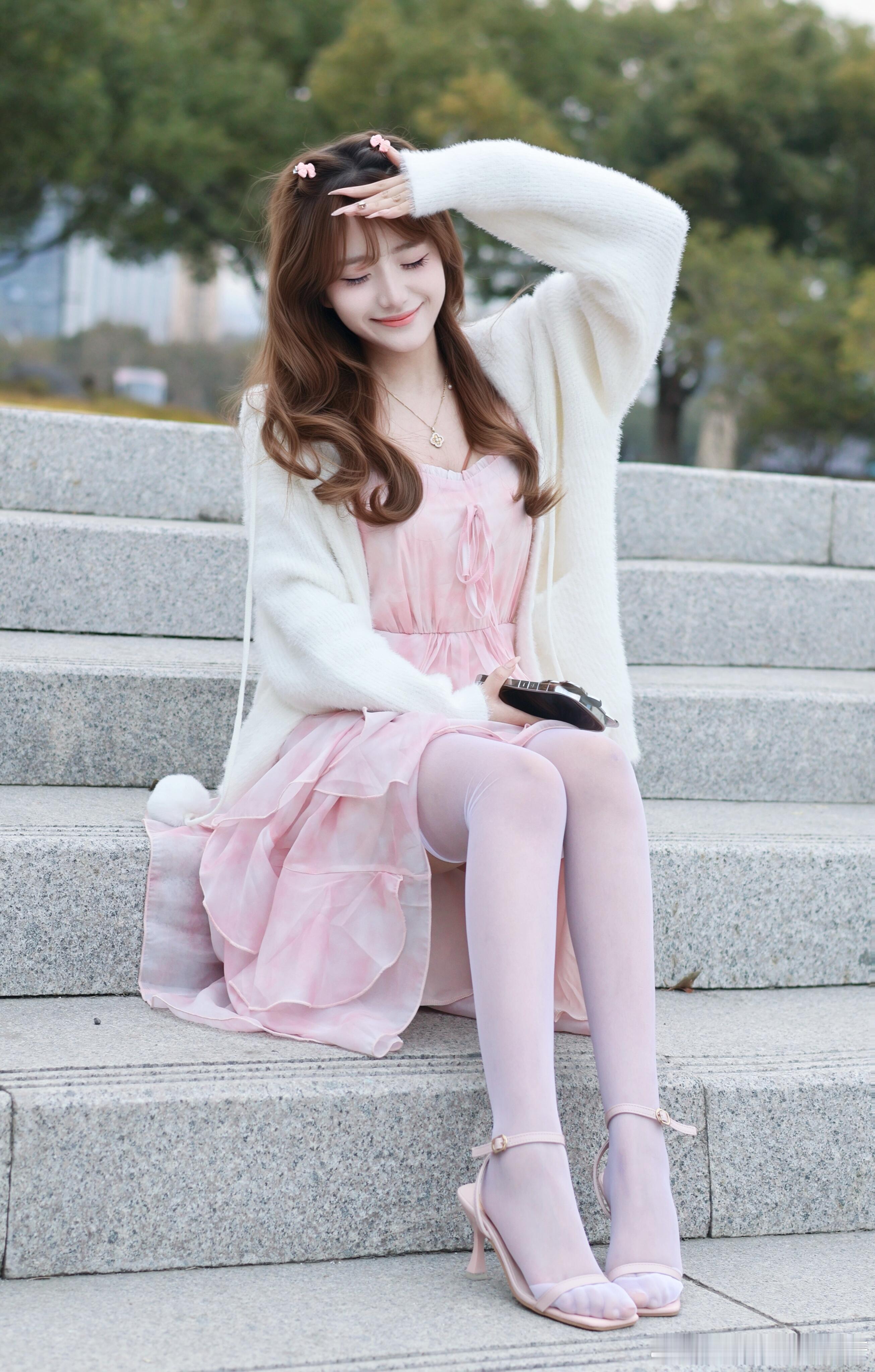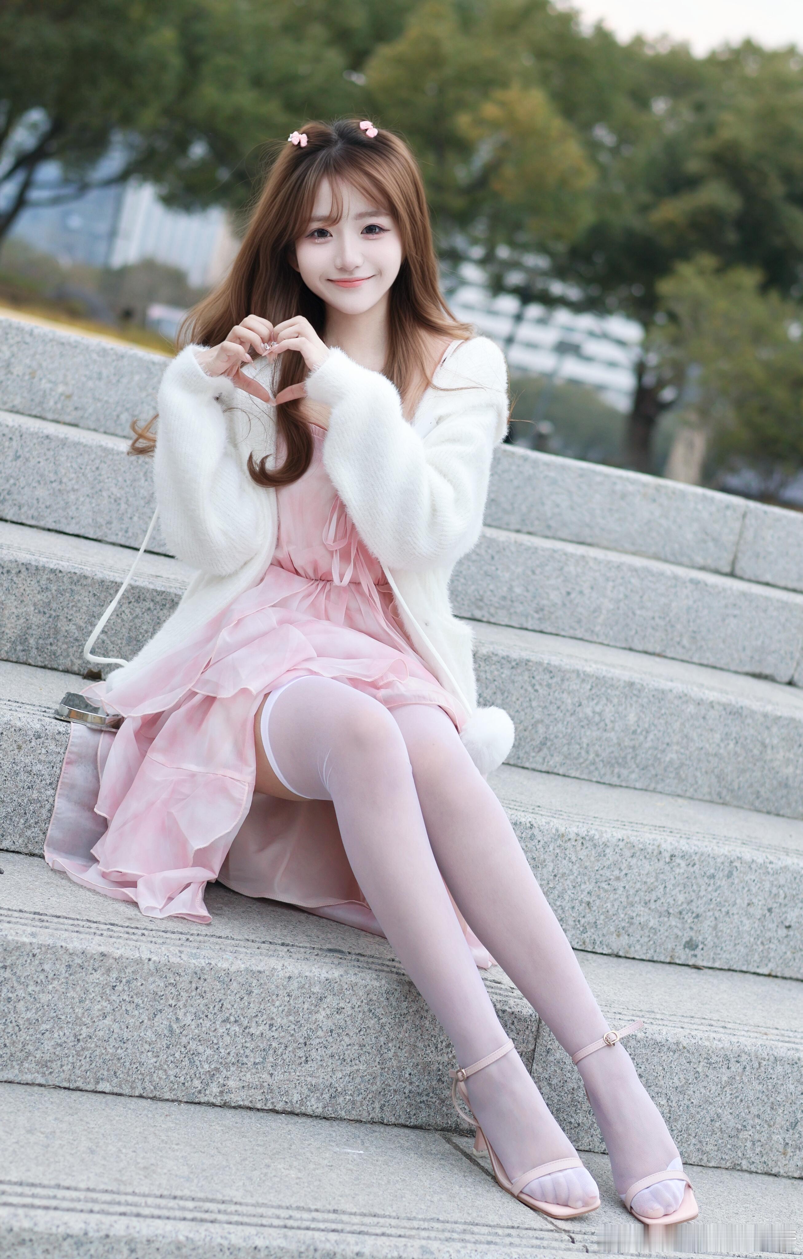 粉色系带可爱怎么能不穿丝袜呢~