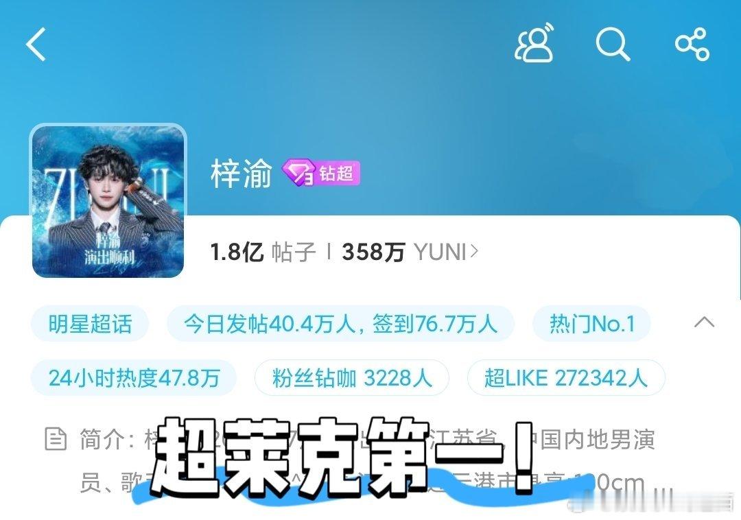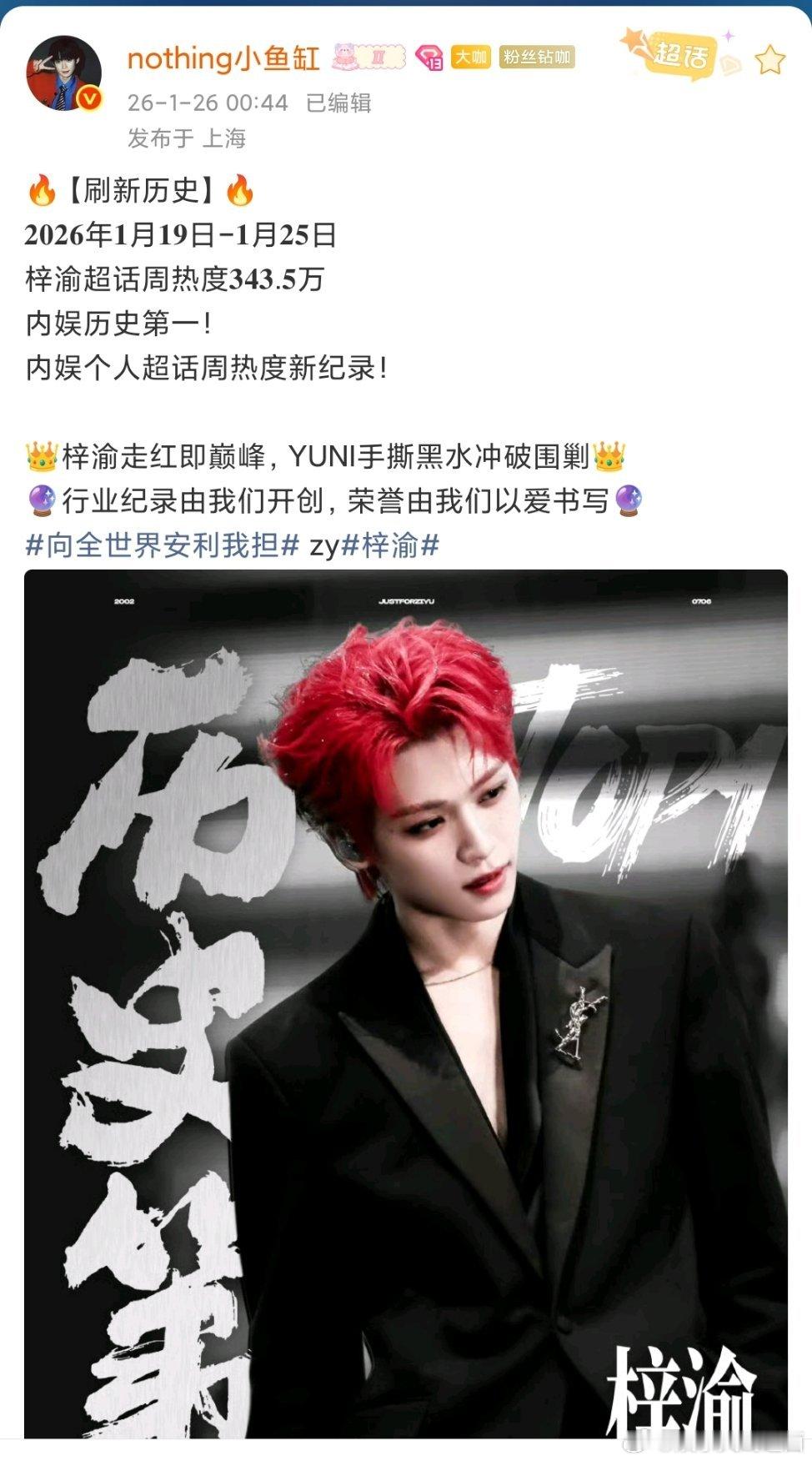 梓渝微博之夜 正主争气yuni好棒🥇1.25超like:272356 内娱第一🥇🔥超话周热度343.5万,内娱历史第一!也是内娱个人超话周热度新纪录!活人头就是多啊,wbzy活动延烧那么久一直高强度参与,超莱克拿回第一,ppm手搓八爪鱼牛🍺!