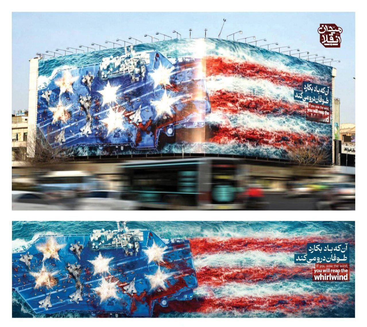 伊朗德黑兰英格拉布广场新近揭幕了一幅壁画,描绘了对一艘美国航母的袭击场景:种恶因