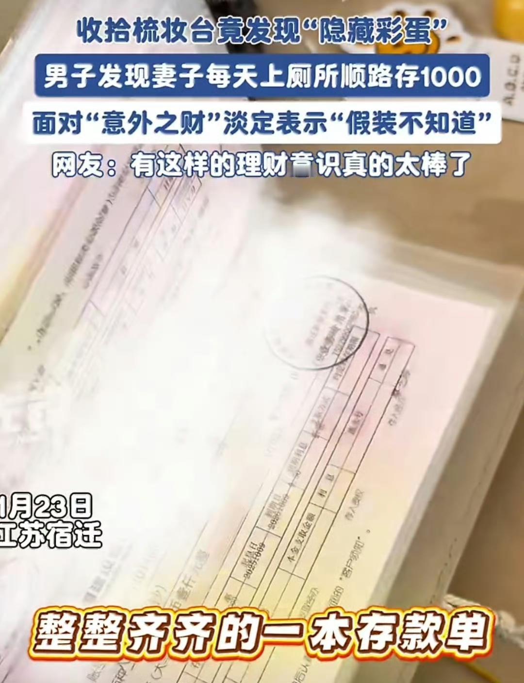 有人靠“上厕所”偷偷攒下一套房的首付。故事就发生在江苏宿迁,一对90后小夫妻,摆摊做点小生意,钱都是当天结当天花,月底一看账户比脸还干净。老公苏先生一直纳闷:媳妇天天说去“上厕所”,怎么一蹲就是半小时?直到年前大扫除,他翻媳妇梳妆台,两本旧记事本里“哗啦”掉出两百张存单,每张一千,整整二十万,码得比扑克牌还整齐。他当场傻眼:原来人家每天“顺路”去隔壁银行塞一张,一年下来,愣是把零钱攒成了“巨款”。 媳妇后来才坦白,摊子上每天流水看着多,可揣兜里就忍不住想花,买杯奶茶、加个烤肠,一百块说没就没。她灵机一动:干脆每天先存一千,眼不见心不痒,省得月底又当“月光族”。银行就在厕所旁边,她干脆把“上厕所”当成掩护,进去先排队存钱,再慢悠悠上个厕所,回家一脸淡定,老公半点没怀疑。苏先生听完哭笑不得:“合着我每天给你望风,你其实在给咱家攒‘私房国库’?” 消息一上网,评论区炸了锅。有人夸媳妇是“最会过日子的膀胱管理大师”,也有人替老公抱屈:“夫妻一场,藏得这么深,信任呢?”更多网友却晒出同款操作——有人把私房钱藏在旧羽绒服内衬,有人用老公身份证另开账户,每天转五十,五年攒出孩子学费。说白了,大家不是不爱家,是被“乱花钱”吓怕了:外卖三十、打车二十,工资到账还没焐热,就贡献给各种“精致生活”广告。存钱的仪式感,反而成了安全感的来源。 苏先生最后把存单拍了张照片,发到网上,配文:“媳妇不想让我知道,那我就不问,咱有这觉悟。”一句话,把尴尬化成宠溺。第二天,他把摊子早点收,带媳妇去银行开了联名账户,把二十万转进去,顺便办了张“家庭储蓄卡”,约定以后每天收摊,俩人一起存五百,谁也别偷跑。媳妇不好意思地笑:“其实我不是怕你花钱,是怕自己乱花,现在一起攒,心里更踏实。” 所谓“厕所存钱术”,听起来像段子,背后却是小老百姓最朴素的智慧:钱不是赚出来的,是“藏”出来的;家不是讲理的地方,是讲“我愿意”的地方。下次再有人蹲厕所半小时,别催,说不定人家正给未来铺砖添瓦呢。夫妻攒钱记 来源:先锋新闻