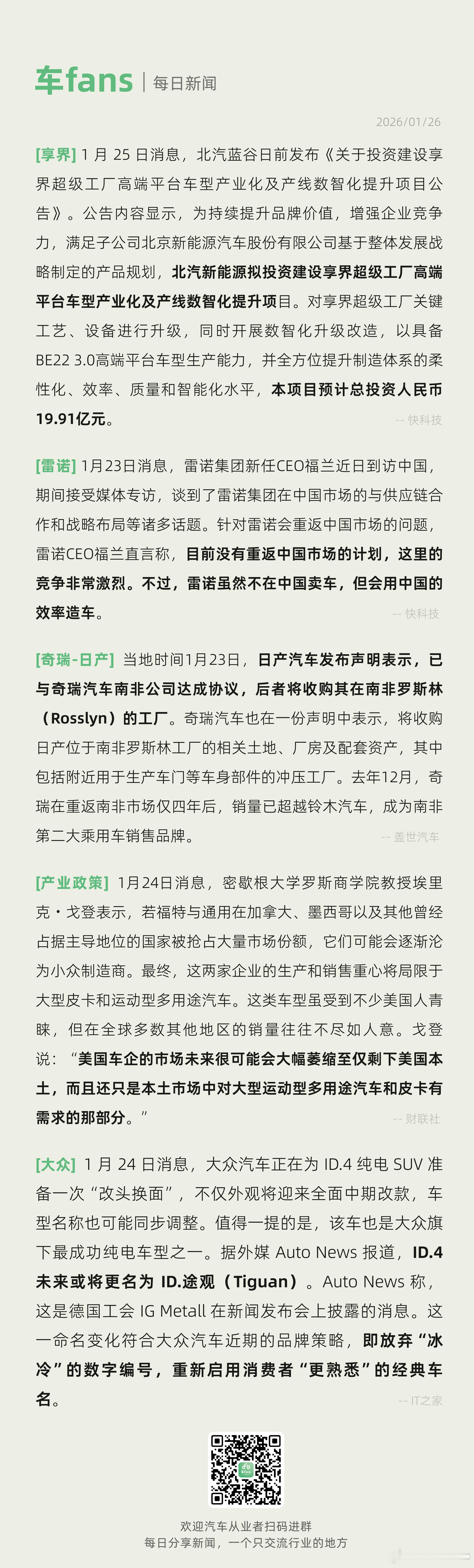 北汽新能源拟投资升级享界超级工厂、雷诺集团新任CEO福兰近日到访中国雷诺集团新任CEO福兰近日到访中国,期间接受媒体专访,谈到了雷诺集团在中国市场的与供应链合作和战略布局等诸多话题。针对雷诺会重返中国市场的问题,雷诺CEO福兰直言称,目前没有重返中国市场的计划,这里的竞争非常激烈。不过,雷诺虽然不在中国卖车,但会用中国的效率造车。省流:虽然我不敢进中国市场,但是我想拿中国的车打海外市场新能源汽车