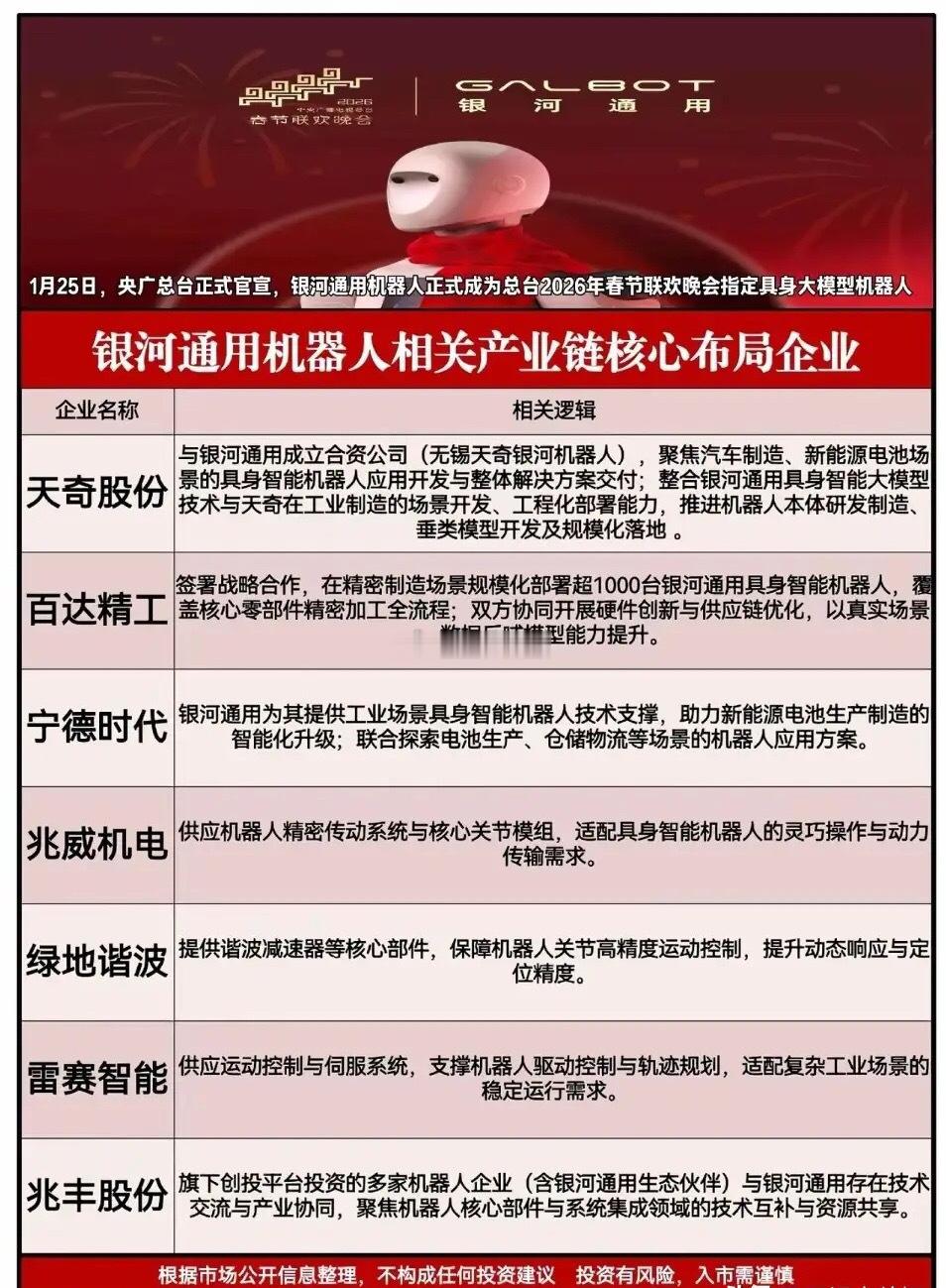 2026春晚机器人合作公司名单曝光,魔法原子和银河机器人谁能成为下一个风口?相关题材概念能否复制宇树机器人概念?春晚机器人阵容炸场!1月25日最新消息,银河通用机器人与魔法原子双双登陆2026央视春晚,成为具身智能与机器人技术的重磅展示窗口。相关概念龙头代表有哪些?银河通用机器人是国内少数实现具身智能机器人在工业场景规模化落地的企业,处于行业第一梯队。公司供应商有绿的谐波、兆威机电。魔法原子是国内人形机器人领域的明星企业,以“技术+场景+资本”三重驱动快速崛起,是当前资本市场最受关注的标的之一。相关概念公司有航天宏图、汇川技术等等。理财有风险入市需谨慎。