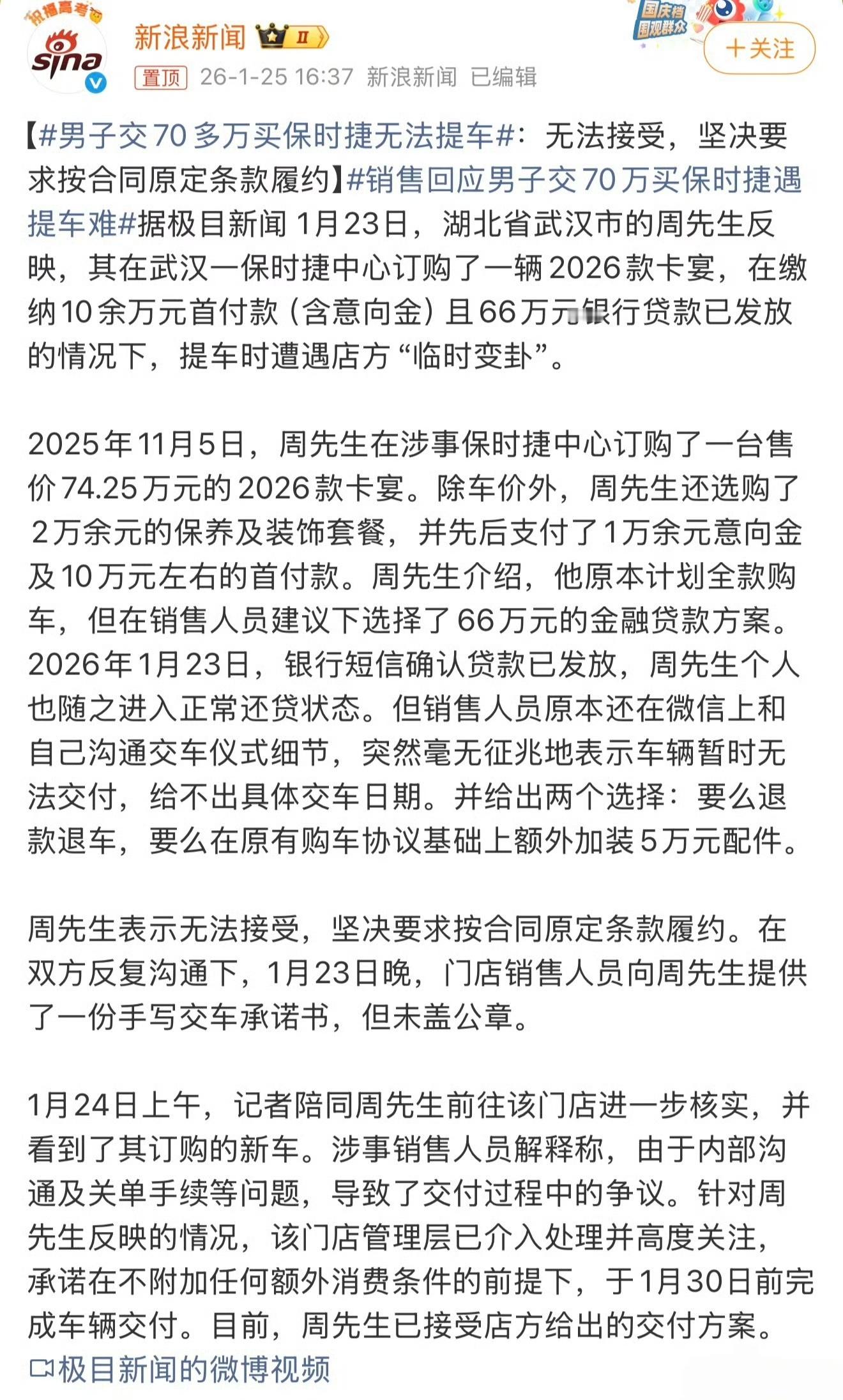 销售回应男子交70万买保时捷遇提车难这要么是2026年厂家政策变了,经销商不挣钱,要么就是有客户出的价格更高,想先交另一个客户。不然没理由在这种环境下,还能在谈妥的价格上加价,能顺顺利利交车就不错了。