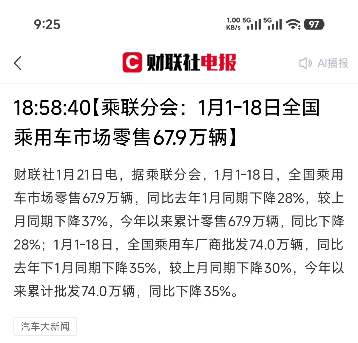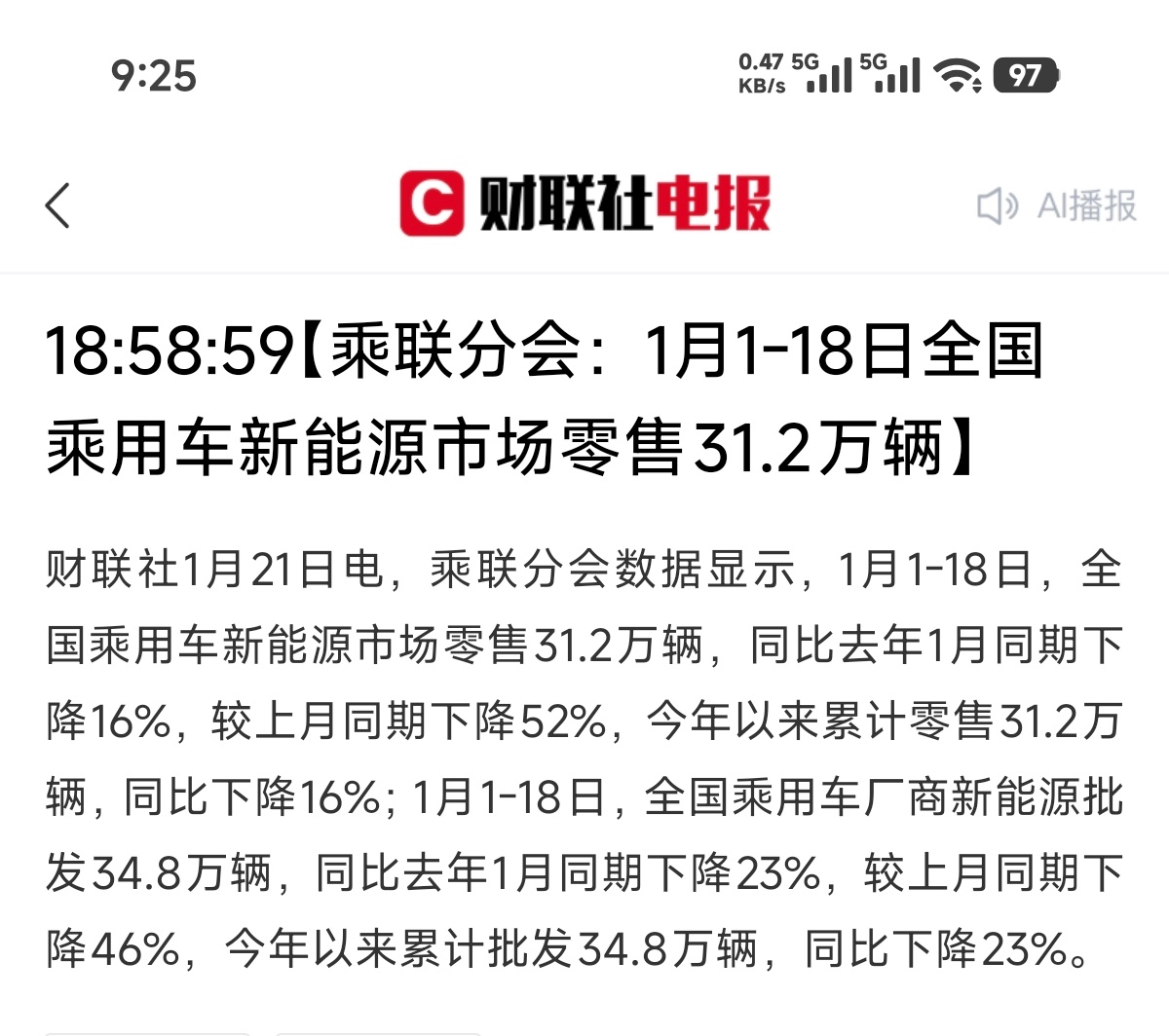2026年一月1-18日,全国乘用车市场零售67.9w辆车,同比下跌28%,批发量74w辆,同比下降35%新能源车零售31.2w辆,同比下跌16%,批发量34.8w辆,同比下跌23%