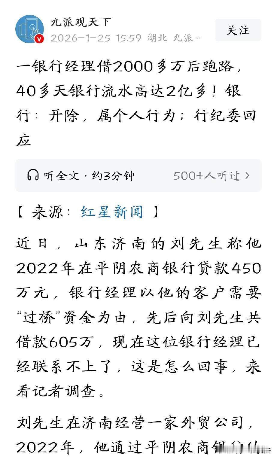 山东济南,为了维持公司经营,男子找银行业务经理贷款450万,事后,经理多次找男子借钱,面子上抹不开,又想着他背后有银行撑着,跑不了,男子便陆续借给对方605万。谁知,等他要钱的时候,却发现经理跑路了,而且,这个经理不止借了他一个人的钱,借了好多人的,有2000多万,40多天的银行流水竟然高达2亿多。男子急了,赶紧找到银行,谁知银行表示:属个人行为,已被开除。 刘先生年轻有为,经营着一家外贸公司,2022年,刘先生通过农商银行一位姓孙的经理,申请了一笔450万的贷款。 贷款批下来后,刘先生和孙经理也就慢慢熟络起来了。 孙经理知道找刘先生兜里有钱,之后便经常找他借钱,次数越来越频繁。 刘先生一开始心里其实也犯嘀咕,但转念一想,孙经理这人平时为人处事看着还不错,而且背后还有这么大一家银行呢,应该不会出啥问题,就把钱借出去了。 就这么一直借到2025年1月份,刘先生借完最后一笔钱后,突然发现联系不上孙经理了。 刘先生赶紧核算了一下,好家伙,孙经理前前后后一共欠了他605万。 这600多万可不是个小数目,刘先生的公司根本承受不住这样的损失,再补不上这个窟窿,自己的公司可能就黄了。 刘先生心急如焚,赶忙联系银行,想着银行总能找到孙经理吧! 可银行那边一口咬定,说孙经理请假了,他们也联系不上,到了3月份,又说孙经理被开除了。 刘先生这下更慌了,他又多次跑到银行去询问情况,不问不知道,一问吓一跳。 孙经理可不只是借了他一个人的钱,还借了十多个人的,总金额加起来竟然高达2000多万。 刘先生又气又怕,气这孙经理太不地道,怕自己的钱就这么打水漂了。 为了搞清楚这到底是怎么回事,记者跟着刘先生还有其他几位借款人一起,来到银行城区支行。 支行行长说,他刚到这家支行工作才1年,对孙经理的情况不是很了解,不过他表示会把几位借款人的诉求向上级领导反映。 刘先生还提到,因为自己一直追着孙经理要债,后来孙经理为了证明自己没钱还,就把两张银行卡的流水发给了他。 刘先生一看这流水,直接傻眼了。从2022年到2025年,仅仅这两张卡,3年时间的进出流水就高达5个多亿。 最夸张的是孙经理失联前的2024年12月份,40多天流水就达到了2个多亿。 而且这些流水里,基本没有什么所谓的银行“过桥”业务,全都是用于高消费。刘先生这才意识到,自己完全被孙经理给骗了。 行长说银行已经对孙经理进行了处分,可到底是怎么处分的呢? 记者又跟着刘先生他们来到了银行纪委询问情况。 当刘先生提出有没有深入调查孙经理的问题时,纪委工作人员却没有给出正面答复,这让刘先生心里更加没底了。 自己本来是出于信任才借钱,哪想到会变成现在这样,现在只盼着能把钱追回来,可这看起来似乎遥遥无期。 这种情况可怎么弄,难道我贷了款,经理死了,我是不是就不要还了,因为我贷款是和经理的个人行为,和银行无关。 也有人猜测,刘先生肯定是拿个人家的高额利息,为了蝇头小利,把钱借给人家过桥,然后被骗了。