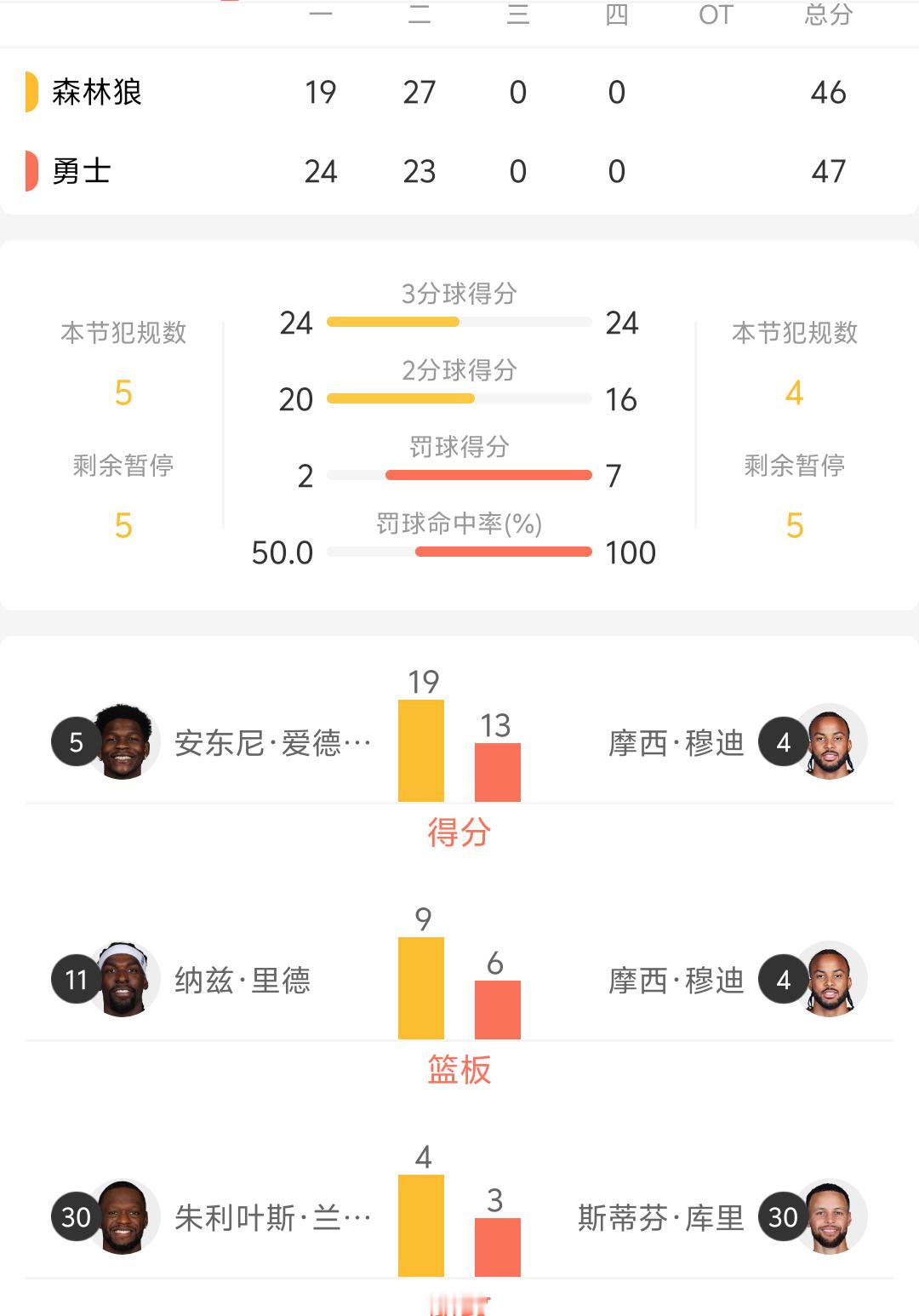 半场结束 勇士领先一分森林狼15个失误 勇士就领先一分下班场加油吧金州勇士勇士vs森林狼