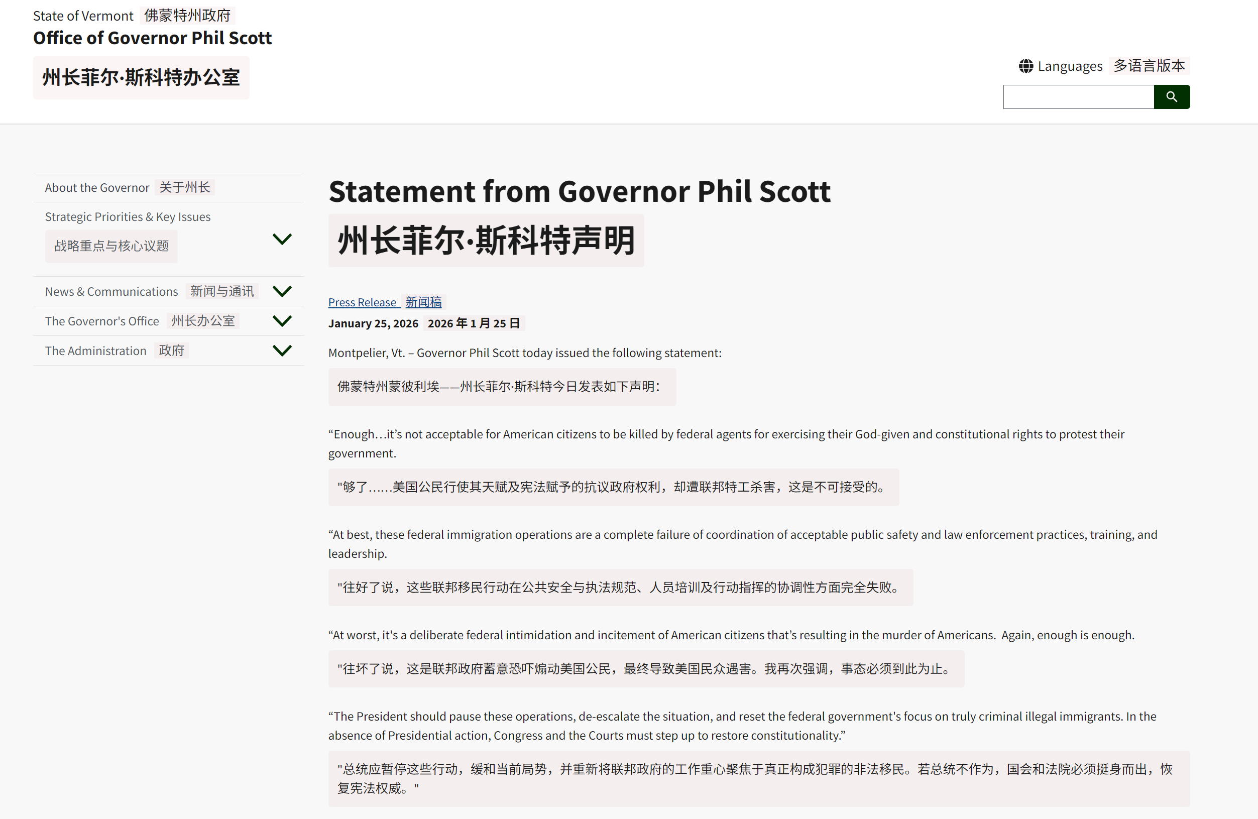 🔻周日早上,随着抗议者与联邦探员在明尼阿波利斯持续对峙并发生第二起美国公民遭枪击事件,佛蒙特州的共和党州长菲尔·斯科特发表了一份声明,声明内容是:🔻“够了……美国公民行使其天赋及宪法赋予的抗议政府权利,却遭联邦特工杀害,这是不可接受的。往好了说,这些联邦移民行动在公共安全与执法规范、人员培训及行动指挥的协调性方面完全失败。往坏了说,这是联邦政府蓄意恐吓煽动美国公民,最终导致美国民众遇害。我再次强调,事态必须到此为止。总统应暂停这些行动,缓和当前局势,并重新将联邦政府的工作重心聚焦于真正构成犯罪的非法移民。若总统不作为,国会和法院必须挺身而出,恢复宪法权威。”🔻声明发表在佛蒙特州政府网站上。🔻斯科特的共和党身份为他的批评增添了分量,因为这并非来自民主党对手,而是来自共和党。斯科特对特朗普的批评凸显了红州与特朗普团伙内部在移民执法问题上的紧张关系,更凸显了共和党温和建制派与MAGA基本盘之间的裂痕。这可能鼓励其他红州或摇摆州的共和党人表达异议,尤其是在公众反对声浪高涨的情况下,或将在中期选举或政策推进前使共和党的团结问题复杂化。🔻这些共和党政客受不了特朗普团伙瞎搞了,再瞎搞中期选举真的要寄了。🔻他不是第一个跳反的共和党人,也不会是最后一个。原来他才是牢A 美国ICE行刑式处决 热点现场 海外新鲜事