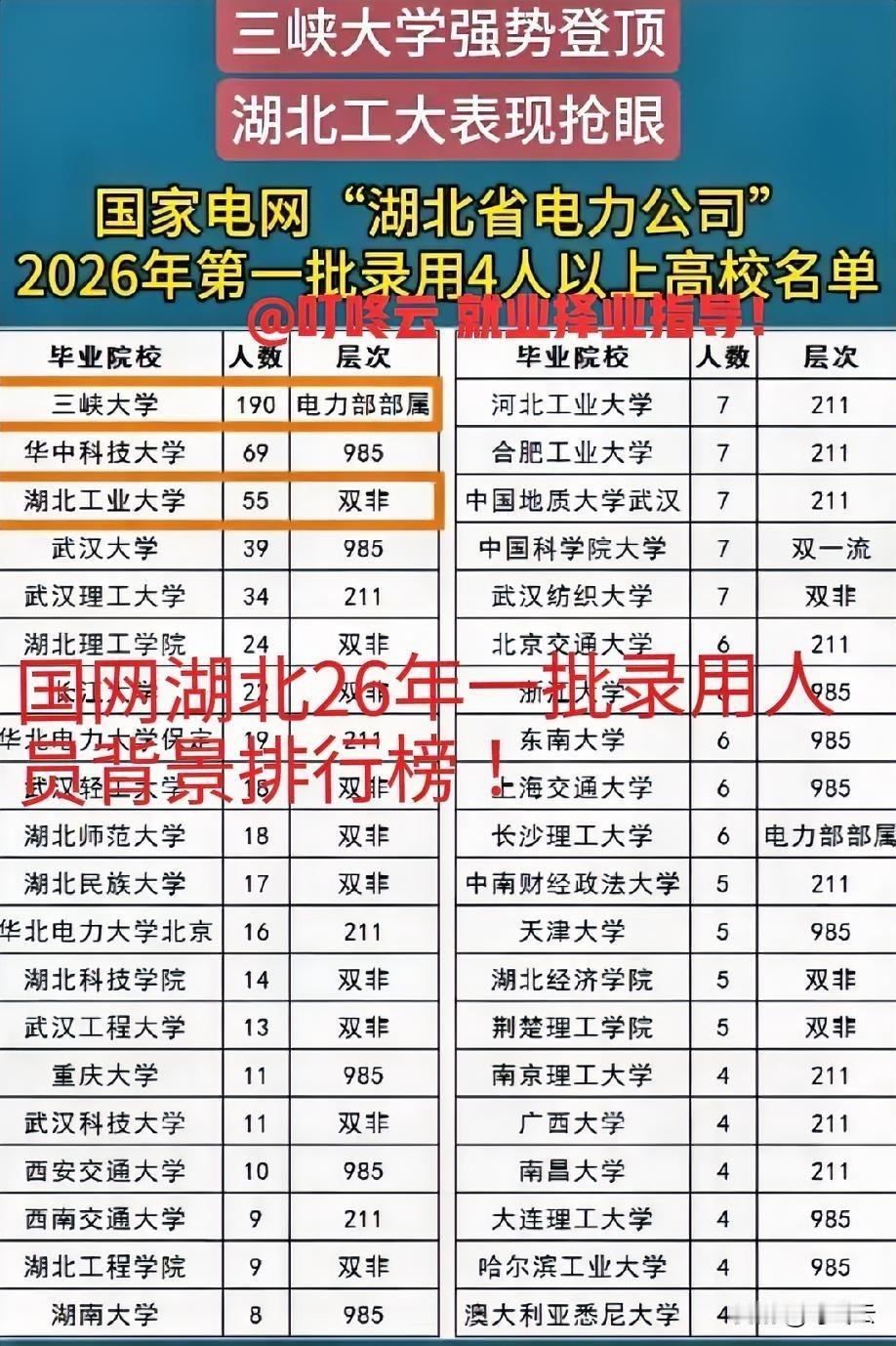 什么大学进入国家电网更有优势呢? 国家电网湖北电力26年一批录用人员背景排行榜揭秘!有多少人在悔恨交加!费心劳神考上华北电力大学、西安交通大学等重点大学,还是回老家工作了!和三峡大学、湖北工业大学等双非院校一起工作,一起去一线爬杆查表!比如一个西安交通大学毕业生考上华北电力,必须去一线历练,能不能坚持过三年轮岗期,就很难说啊。速速围观揭秘详细内容!你觉得考上华北电力大学、西安交通大学、西南交通大学,毕业生就业是否值得选择国家电网,你有有哪些看法?欢迎评论区留言交流讨论相关话题。[烟花][烟花][赞][赞] 欢迎关注@叮咚云 将优先为粉丝职业规划指导,为你定制最适合的就业择业方案!欢迎留言交流讨论。[来看我][来看我] 免责声明:图片来自网络,仅供参考!