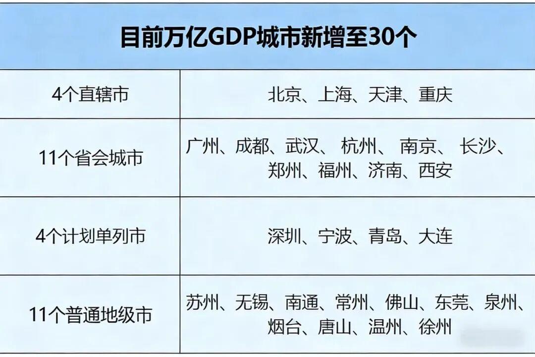 近日,各地陆续公布2025年GDP数据。上海加速向6万亿元迈进,北京突破5万亿元大关,浙江温州、辽宁大连、江苏徐州则进入“万亿城市”榜单。 截止目前,万亿GDP城市已新增至30个! 排名前两位的城市为上海和北京。上海2025年GDP达到5.67万亿元,继续稳居榜首;北京2025年GDP达到5.2万亿元,是第二个超过5万亿的内地城市。 上海、北京GDP为5万亿+; 深圳、重庆、广州,3万亿+; 苏州、成都、杭州、武汉,2万亿+; 1万亿梯队21个:南京、宁波、天津、青岛、无锡、长沙、郑州、福州、济南、合肥、佛山、西安、泉州、南通、东莞、常州、烟台、唐山、温州、徐州、大连。 新万亿GDP路上,下一个,还会有谁?
