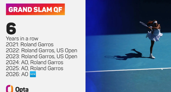 高芙战胜卡罗琳娜·穆霍娃比分 6-1 3-6 6-3 多么精彩的一场比赛 两位选手的某些击球简直令人瞠目结舌 但高芙在大满贯的决胜盘中确实表现非凡 她已连续第三年闯入澳网四分之一决赛 ✅第十次跻身大满贯八强 ✅2026赛季战绩7胜1负 美国球星正在创造辉煌 🇺🇸❤️ 高芙(Coco Gauff)成为自玛丽·乔·费尔南德斯(1990至1993年连续四次闯入八强)以来,最年轻连续三年晋级澳网女单八强的美国选手。达成三连胜纪录。 6 - 高芙(Coco Gauff)成为自辛吉斯(连续七个赛季,1996-2002年)和维纳斯·威廉姆斯(1997-2002年)以来,连续六年以上闯入大满贯女单八强的最年轻选手。纪录仍在延续。 2 - 高芙与约维奇成为自2002年法网的威廉姆斯姐妹以来,首次有两位在22岁前闯入大满贯女单八强的美国选手。历史重现。 高芙目前保持以下连胜纪录: 对阵卡罗莱娜·穆霍娃:近五场全胜(5胜0负) 对阵米拉·安德烈耶娃:近四场全胜(4胜0负) 对阵伊加·斯维亚泰克:近四场全胜(4胜0负)