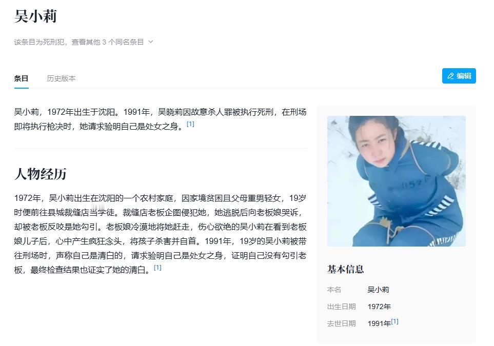 1991年,年仅19岁的沈阳姑娘吴晓丽被判处死刑。在行刑前一秒她却突然要求验明她的处子之身!经过检查,吴晓丽确实还是完璧之身!此刻,所有谣言不攻自破,但她依旧改变不了自己的结局。 那天沈阳气温很低,刑场上站着的人个个裹着厚衣服,只有吴晓丽穿着薄薄的囚衣,脸色苍白,眼神却出奇地平静。 她开口说出的那句话,让现场所有人愣在原地。 公安人员一时间不知如何处理,按理说行刑流程已经开始,可面对一个即将离世的年轻女孩,用尽最后力气为自己讨一个说法,谁也不敢轻易拒绝。 上级很快做出决定,法医临时赶到刑场,几个小时后,结果出来了。 她的身体没有受到侵犯,流传许久的那些关于她不检点、勾引男人的传言,全都是无中生有。 可这一切已经晚了。 吴晓丽出生在沈阳郊外的一个普通农村家庭,是家里最大的孩子,下面有两个弟弟。 家里穷,父母又有严重的重男轻女思想,所有资源和心思都放在儿子身上,吴晓丽从小就是“多余的那个”。 她读书很努力,成绩也不错,但父亲根本不在意,觉得女孩子读书再好也没用,迟早是别人家的人。 十四岁那年,父亲让她辍学,托人把她送到城里一间裁缝铺学手艺,说是能挣钱贴补家用。 她其实是高兴的,觉得终于有机会离开那个家,哪怕日子辛苦些,只要能靠自己的本事活下来,就是一种自由。 裁缝铺的老板是一对中年夫妻,刚开始对她还算客气,她白天干活学技术,晚上睡在拼起来的几张凳子上,虽然吃不好、睡不好,但心里有盼头。 问题慢慢暴露出来,老板开始变得不规矩,只要老婆不在店里,他总是找借口靠近她,动手动脚。 她不敢说,也不敢跑,怕丢了这份来之不易的工作,更怕家里知道后怪她不守规矩。 一次老板娘回娘家,铺里只剩她和老板。 深夜里,老板喝了点酒,硬是扑了上来,她死命挣扎,顺手抓起裁布刀划破了老板的手臂,才趁乱逃了出去。 她跑到老板娘家里求助,却被骂得狗血淋头,说她勾引男人还诬陷好人,最后被赶了出来。 老板反过来在街坊邻居中散布流言,说她不知羞耻,主动贴上他,被拒绝后才闹事。 流言很快传回村里,吴晓丽回到家想找个说法,结果等来的却是父亲的拳头和一句话,说她丢尽了家里的脸,早点嫁出去才是正路。 她母亲一边哭一边劝她忍忍,说女孩子命苦,早点认命就不那么折腾。 有人给她介绍亲事,对方是个傻子,父亲一口答应,理由是傻子也能娶媳妇,反正她也不值钱。 那天她没说话,一个人跑出家门,在夜里走了很久,心里恨得发抖。 她不是没有想过自杀,但她更不甘心。 她觉得毁了她一生的,不是命运,而是那个男人和一张张冷漠的脸。 她开始盯上那个男人的孩子。 1991年初的一个傍晚,她在学校门口找到了孩子,递给他几颗糖,把他哄到不远的树林里,用一块石头结束了那个无辜生命。 她没有逃跑,拿着染血的石头走到派出所门口,主动承认了自己的罪行。 她没有请律师,也没有为自己辩解,法院审判当天,她低着头听完判决,没有任何表示。 所有人都说她是个冷血的坏女人,连孩子都不放过,街头巷尾到处是骂她的声音。 可没人去想,一个十九岁的女孩,为什么要走到这一步。 她不是天生的恶人,她是一步步被逼到悬崖边上。 她不是为了逃避审判请求验身,她只是想让这个世界知道,她从来没有做过那些被说出口的肮脏事。 她的清白,是她死前唯一能带走的东西。 她闭上眼之前,看着那份验身报告,眼角有泪滑落。 行刑那天,她没有挣扎,也没有哭喊。 她只是站在那里,像个终于放下心事的人。 那场雪下得很大,地上很快积了厚厚一层,盖住了她倒下的身影。 她不是英雄,更不是烈士。 她的死,是那个年代无数普通女性命运的缩影。 她的遭遇提醒我们,有些伤害不是一把刀,而是一句流言,一个眼神,一次沉默。 她没能等到一个为她出头的人,只能用最极端的方式反抗。 如今我们有了更健全的法律制度,有了更多保护女性的机制,但像吴晓丽这样的故事,依旧不该被忘记。 参考资料 吴小莉-快懂百科