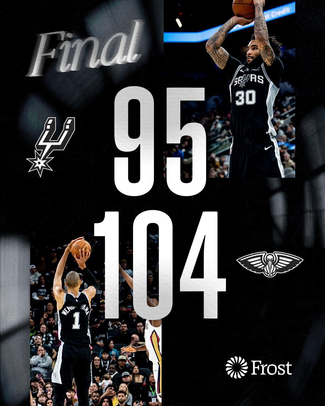 全场比赛结束!马刺主场95-104不敌鹈鹕马刺(32-15):文班亚马16分16板4帽、凯尔登15分2板1助、尚帕尼13分4板1助、瓦塞尔13分1板1助、福克斯12分2板7助、布莱恩特6分2板、科内特5分8板1助、哈珀5分6板3助、卡斯尔5分4板5助、巴恩斯5分1板3助鹈鹕(12-36):贝24分10板4助、锡安24分10板4助、墨菲17分6板9助、米西10分14板2助2帽、琼斯9分3板2助2帽、费尔斯8分3板、阿尔瓦拉多6分5板1助、奎因4分4板1助、马特科维奇2分1板、皮维2板马刺下一场将在1月29日客场挑战火箭超话创作官 |篮球年末狂欢季 |鹈鹕战胜马刺