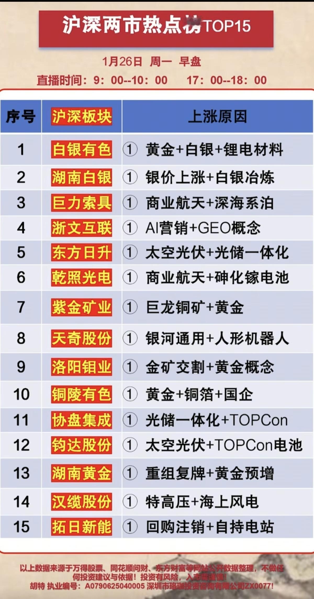 1.26周一 人气股热榜+主力资金抢筹榜 1.黄金白银+锂电材料 2.商业航天+砷化镓 3.人形机器人 4.光储一体化 5.太空光伏+特高压+海上风电
