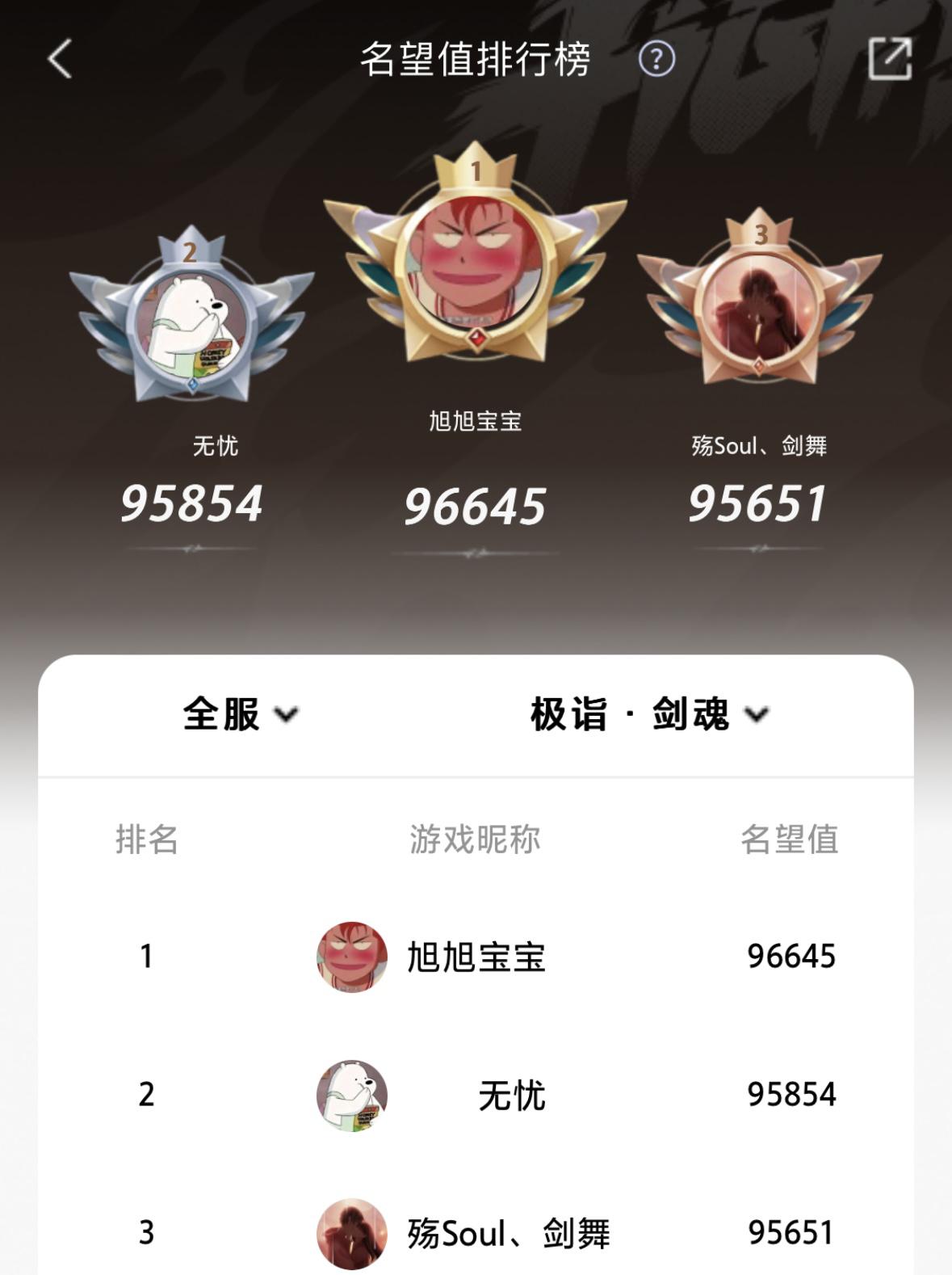 旭旭宝宝的名望再次刷新,来到了96645,重回国服第一宝座。在前天,有两位剑魂的