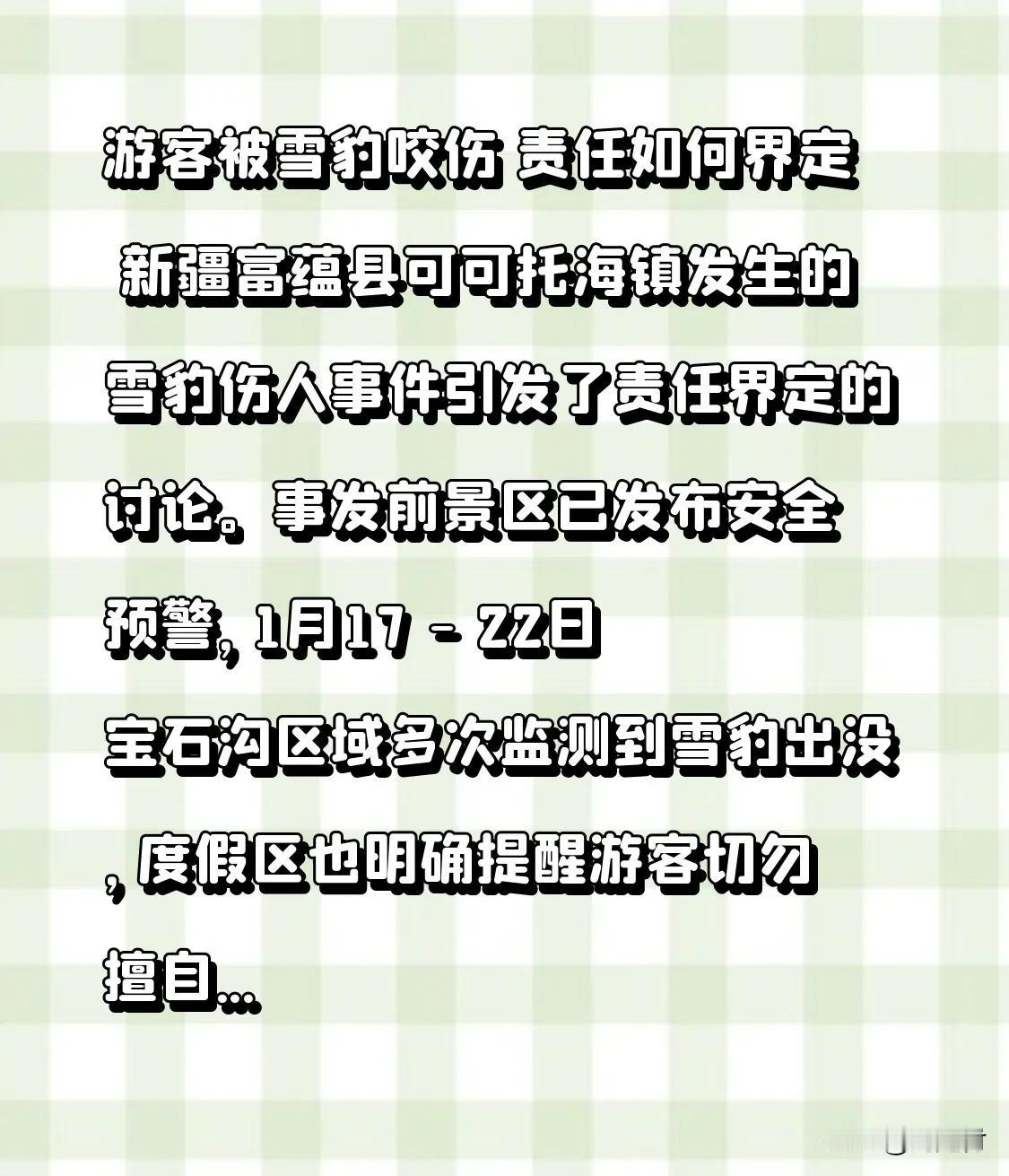 游客被雪豹咬伤 责任如何界定 游客被雪豹咬伤,责任如何界定?新疆富蕴县可可托海镇发生的雪豹伤人事件,引发了关于责任界定的讨论。事发前,景区已发布安全预警,1月17 - 22日,宝石沟区域多次监测到雪豹出没,度假区也明确提醒游客,切勿擅自下车或近距离靠近拍摄。 从法律角度看,景区作为公共场所管理者,负有安全保障义务。但如果景区已充分履行事前提醒,且及时救援,责任划分便另有说法。若游客存在重大过失,损失可能需自行承担。 这与2016年八达岭野生动物园东北虎伤人事件类似,都是游客无视警示。看来部分游客真得提高安全意识,不能漠视规则和自然的危险。 西宁动物园雪豹 雪豹生态调查