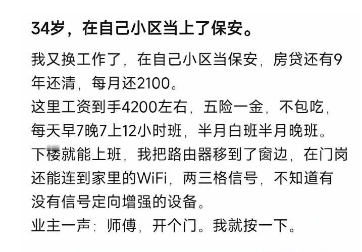 这才是真躺平!34岁男子,在自己小区当保安。房贷还有9年还清,每月还2100,当