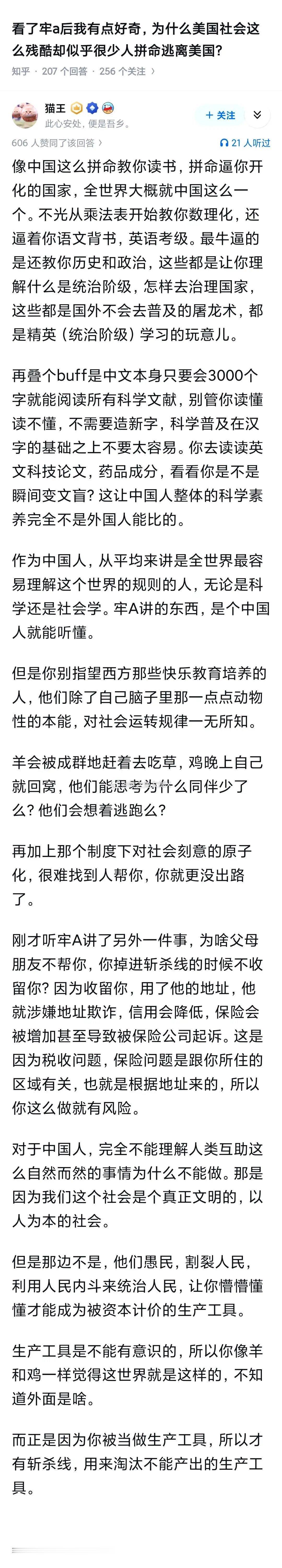 看了牢a后我有点好奇,为什么美国社会这么残酷却似乎很少人拼命逃离美国? 这位网友说的非常有意思。 像中国这么拼命教你读书,拼命逼你开化的国家,全世界大概就中国这么一个。 而西方所谓的快乐教育,不仅让普通人对社会运转规律一无所知,而且很容易成为资本计价的生产工具。 对于中国人,完全不能理解人类互助这么自然而然的事情为什么不能做。 那是因为我们这个社会是个真正文明的,以人为本的社会。 而美西方是以资财为本的社会,产生斩杀线,也就不奇怪了。