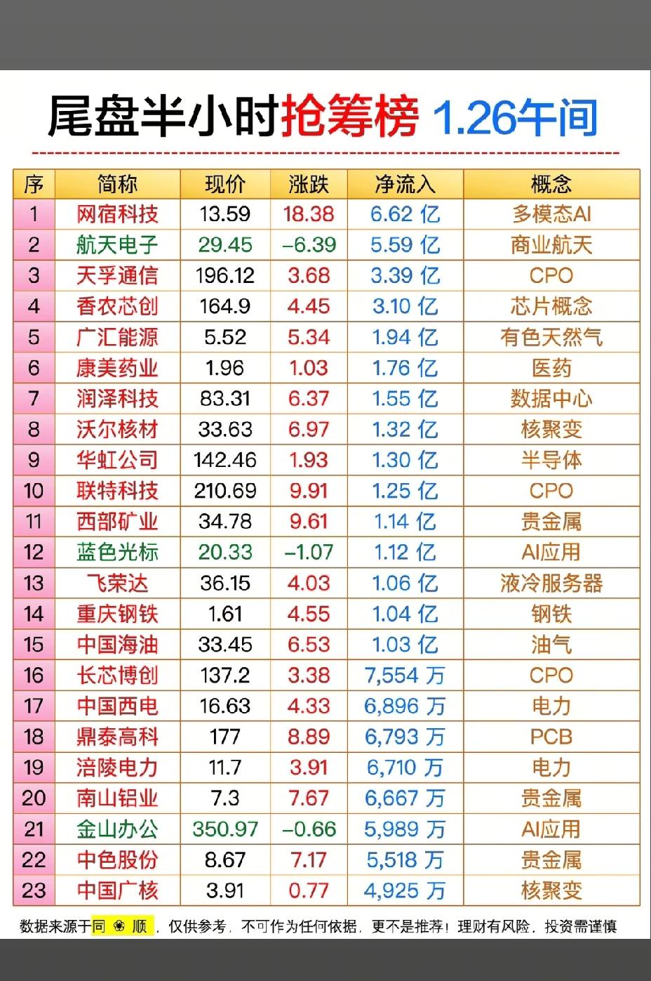 1月26日,周一午盘尾盘半小时抢筹榜!!!