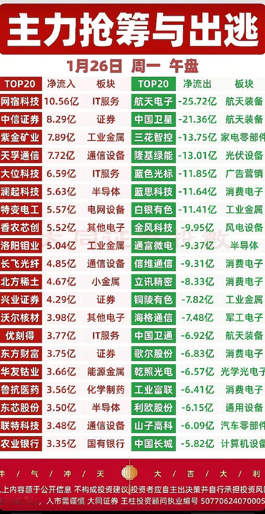 1月26日,周一A股午盘主力抢筹出逃榜!!!
