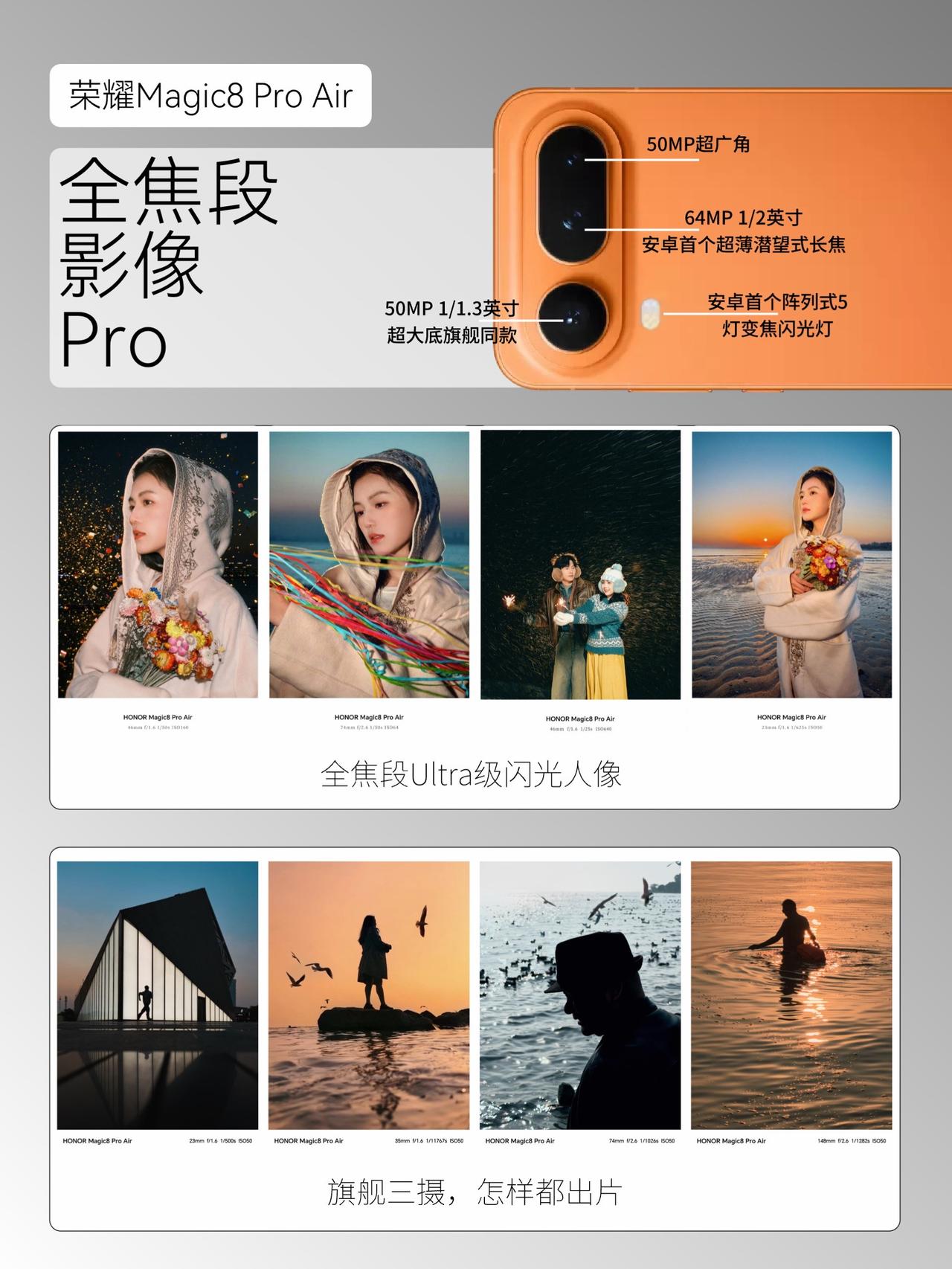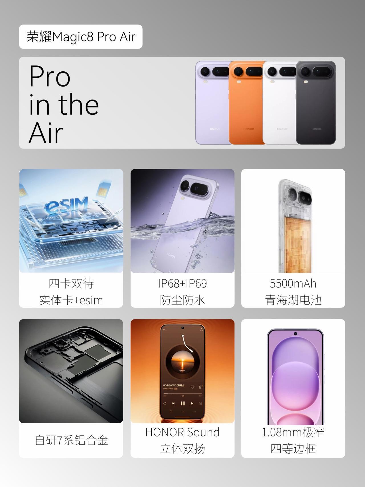 又想要Air又想要Pro?现在终于有了答案! - 一提“Air”,脑子里蹦出来的就是:轻薄。但下一秒就会下意识担心:那拍照、续航、性能…是不是都为了“薄”而牺牲掉了?没错,这几乎成了“Air”系列的隐形标签 - 🔍 先看看iPhone Air,必须承认,iPhone Air把“薄”和“美”做到了极致,钛金属边框的质感无敌😂但为了这份极致,它在配置上做了减法妥协:单摄和电池小就造就了不想拿出手机拍照和无时无刻充电宝不离手… - ✨ 然后,荣耀Magic8 Pro Air来了:它想重新定义“Air”,于是把旗舰级的“Pro”配置,塞进了极致轻薄的“Air”机身里,确实为喜欢漂亮手机的女孩子兼顾到了实力配置! - 🙋轻薄与手感 ✅荣耀Magic8 Pro Air的机身做到了6.1mm超薄,轻至155g,握在手里,是实实在在的“轻若无物”,放在裤子口袋或者小手袋里都不累赘,简直轻到飞起! - 🎮核心配置与续航 ✅荣耀Magic8 Pro Air搭载天玑9500旗舰芯,最关键的是塞进了5500mAh超大电池,支持80W快充,续航和回血速度很有安全感,出门吃漂亮饭和姐妹逛街回到家都还有电 🍎iPhone Air搭载A19 Pro芯片,电池约3149mAh,仅支持20W充电,回血实在是有些差强人意,谁懂每次出门都要到处找充电宝的痛 - 📷影像系统 ✅荣耀Magic8 Pro Air有旗舰后置三摄,包括大底主摄和潜望式长焦镜头,远近皆清晰,关键还有安卓☝️个阵列式变焦闪光灯,带出去拍照,光直接拿捏CCD闪光氛围感照片好吧 - 🙋🏻‍♂️其他的细节,荣耀Magic8 Pro Air有双扬声器,而iPhone Air依旧单扬声器,采用eSIM,着实难受😣 ✅而且荣耀Magic8 Pro Air还有IP68/IP69 Pro级防尘防水,这点也属实贴心了,对比iPhone Air真的就是超值满配的Air - 💎当然,iPhone Air的设计感和系统体验依然顶尖 🔥但如果你是一个对手机综合体验有要求,又实在厌倦了“半斤机”的“重量敏感型用户”,那么荣耀自研业界最小封装的研发技术点(109个器件小型化的处理工艺)确实达到惊叹轻薄不减配的效果。荣耀Magic8 Pro Air也提供了一个非常独特、且更具实用主义色彩的新选择,满配得很Pro,轻到飞起的Air! - 荣耀Magic8ProAir iPhoneAir 手机数码