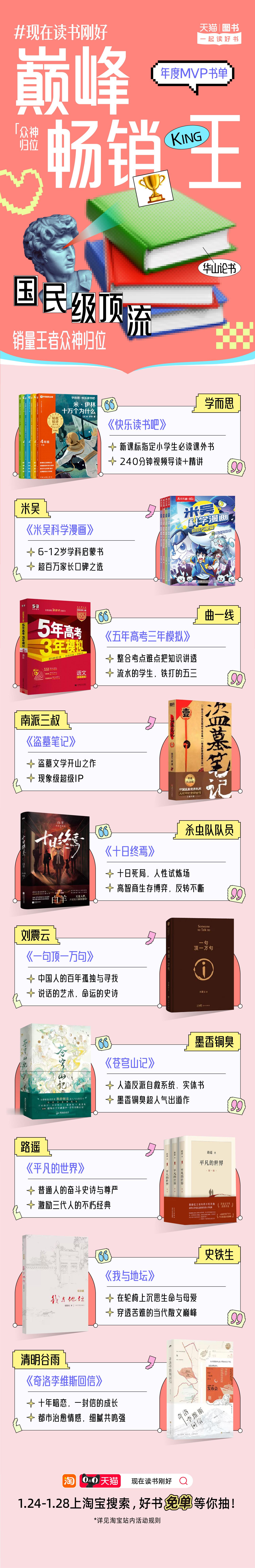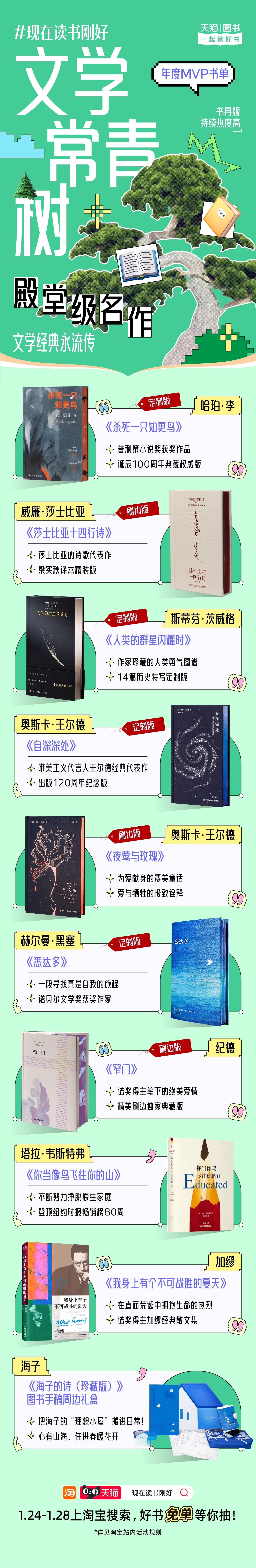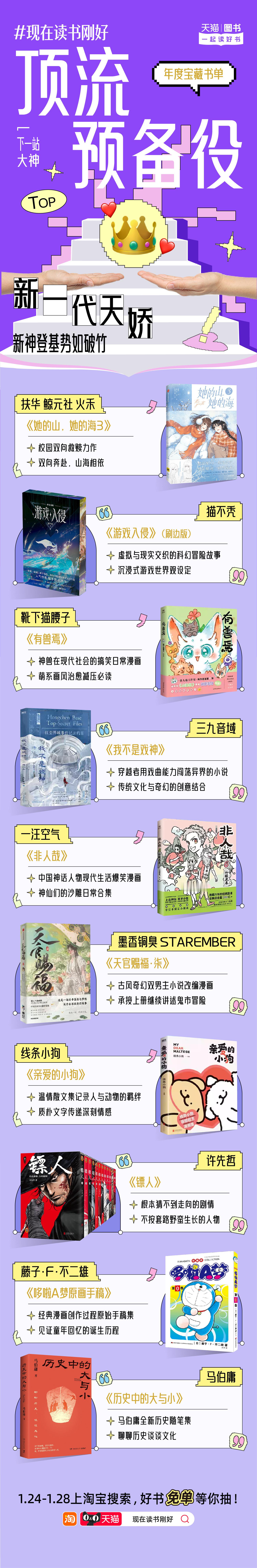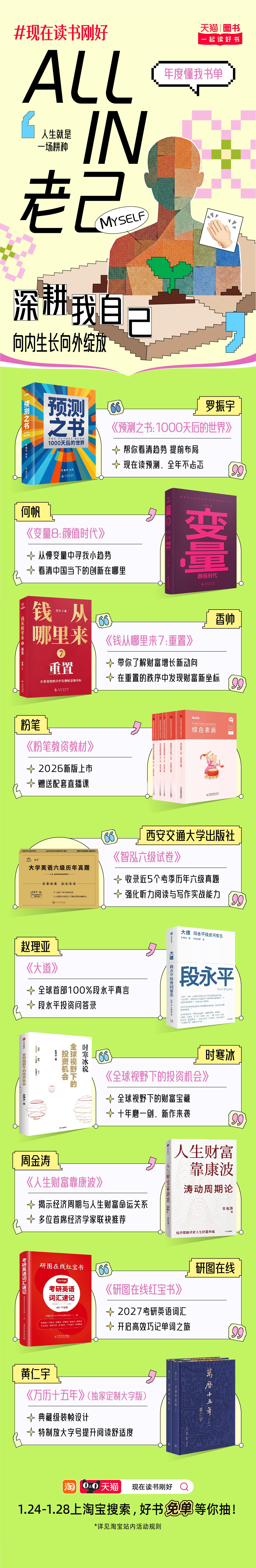 不允许还有人不知道天猫图书2026年度书单已经上线!即日起至1月28日,上淘宝搜索【现在读书刚好】还有超多好书免单等你来抽! 天猫读书 文学常青树、顶流预备役、潮流社交货币、纸上艺术馆、发疯顶级嘴替等11大书单类型丰富,你最Pick哪一本?现在读书刚好