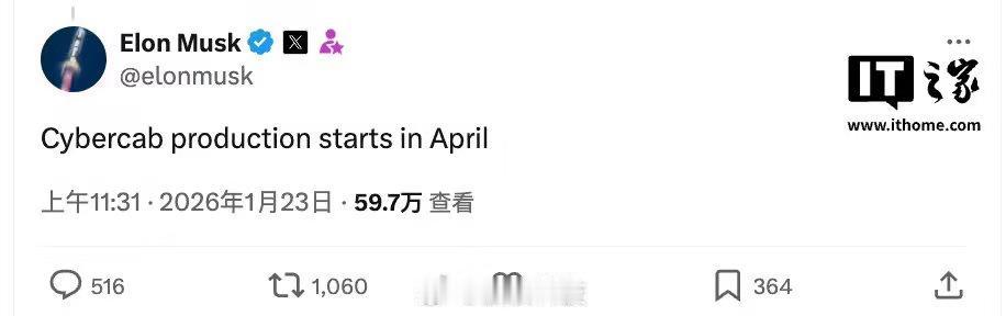 埃隆·马斯克在X平台回复网友时重申,特斯拉旗下的自动驾驶出租车Cybercab计划于今年4月投入量产,目前原型车已在美国阿拉斯加进行低温环境测试。值得关注的是,测试车辆装配了雪地专用轮胎。(IT之家)