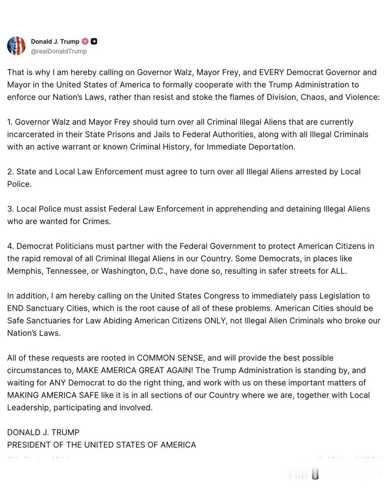 最新消息:美国总统特朗普在社交媒体发文,直接向国会以及每一位民主党籍州长和市长提出要求: - 将目前关押在州监狱和地方监狱的所有外国罪犯移交给联邦当局,立即遣返。 州和地方执法部门必须将地方警察逮捕的所有犯罪外国人移交给联邦当局。 地方警察必须协助联邦特工拘留犯罪的外国公民。 民主党领导人必须与联邦政府合作,遣返犯罪的非法移民。 国会必须通过立法终止庇护城市制度。 “所有这些要求都基于常识,并将为让美国再次伟大创造最佳条件!” 美国人民投票支持大规模驱逐出境。所有当选官员都有责任向选民负责,协助特朗普政府执行这项政策。