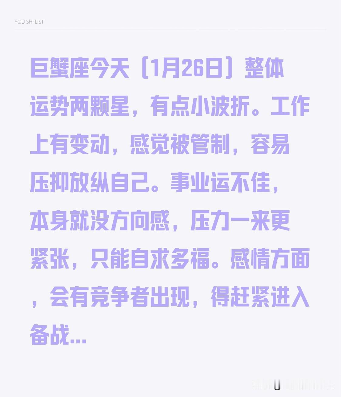 巨蟹座今天(1月26日)整体运势两颗星,有点小波折。工作上有变动,感觉被管制,容