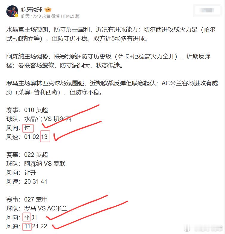 昨天 整体还算稳。赛前分析的时候觉得水晶宫主场有戏、罗马那场防守型对决容易出平局,都走出来了。阿森纳那场确实判断失误,曼联的反击太狠了,卡里克上任后这股劲儿没白费。继续保持平常心,继续交流复盘 今天继续。