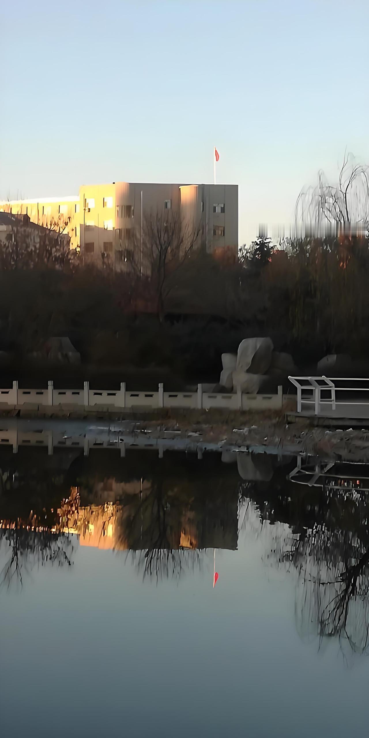 清晨,一轮红日从东方地平线冉冉升起,市内的高楼静静地倒映在公园清澈见底的小湖中,