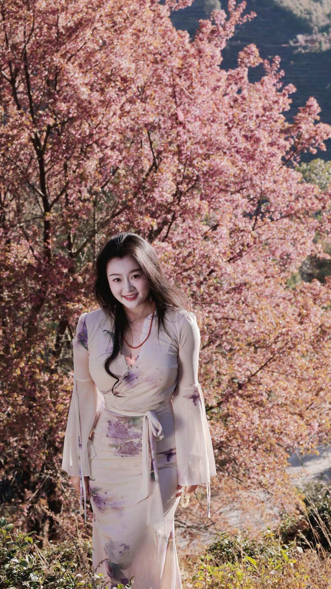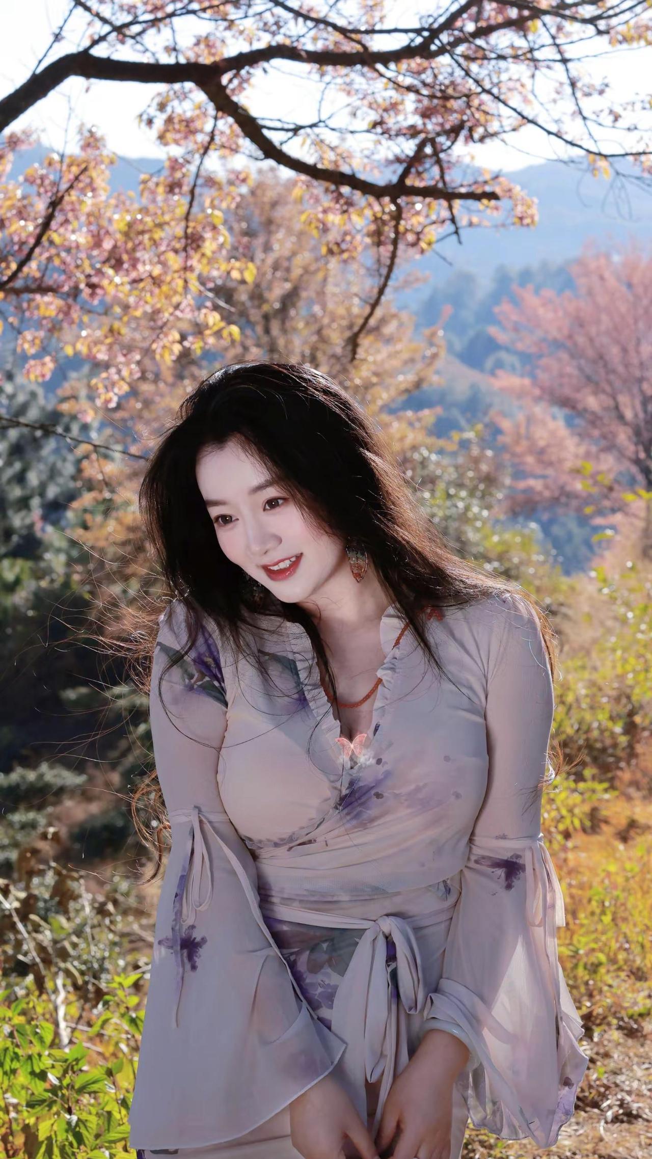 樱花树下,少女微笑,冬日暖阳,美好时光。