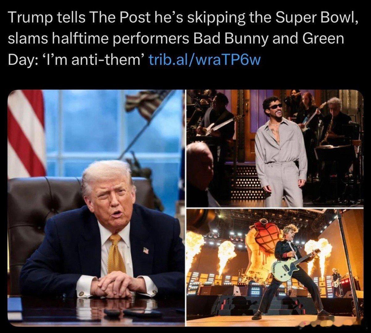 今年美国职业橄榄球大联盟的决赛,两个🏈队来自Pacific Northwest🌲和 New England🦞,在Coastal California🌊打比赛,表演嘉宾是Bad Bunny和Green Day…堪称史上最“Woke”的超级碗总统已经表态:抵制!