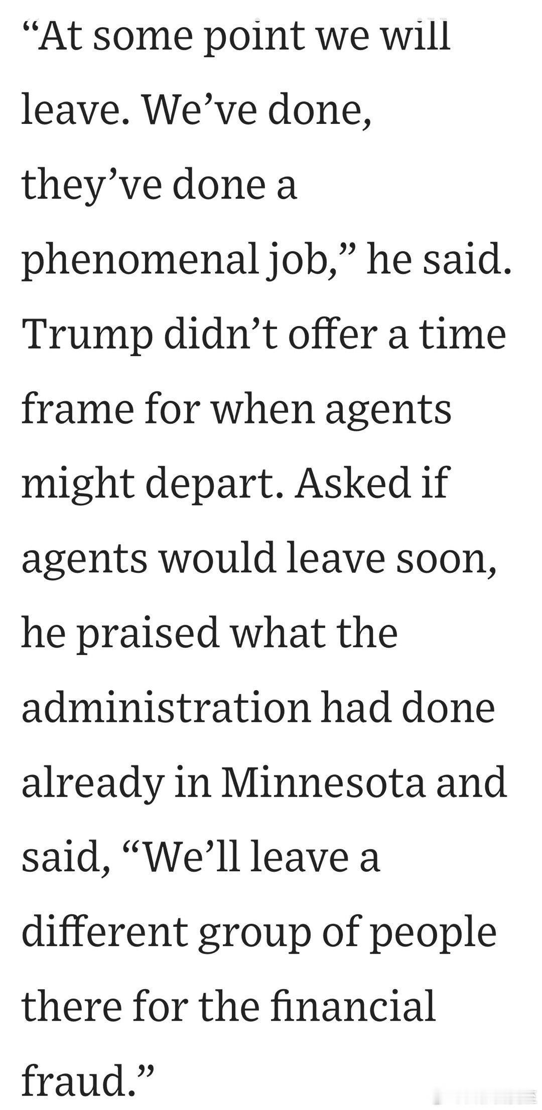 美国总统接受采访时表示:正在审查明州“ICE枪杀公民”事件,还没有正式结论…到一定时候,移民执法人员会撤,只留另一批调查“福利诈骗”的人“At some point, we will leave.”~这是Trump极其罕见的公开让步
