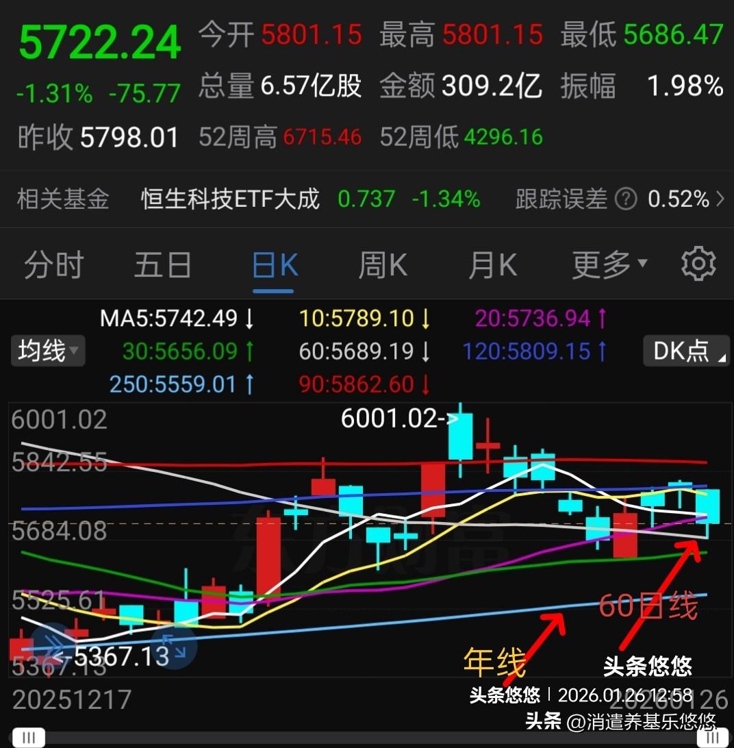 这个港股科技只要守住60日线支撑,就没有问题,后期就能盘整构筑平台,为春节期间上涨做好准备,打好基础。否则要继续回踩下方年线5560点支撑,在年线附近构筑底部,然后春节后发动一次行情。大家都希望春节前后有一次行情,主力给吗?所以说,目前多看少动,不能重仓持有这个恒生科技板块。
