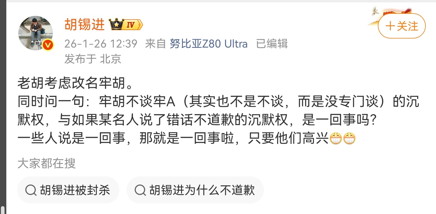 胡锡进就牢A斩杀线发评论一涉及到老胡发声,免不了就出现偷换概念现象。第一,老胡这
