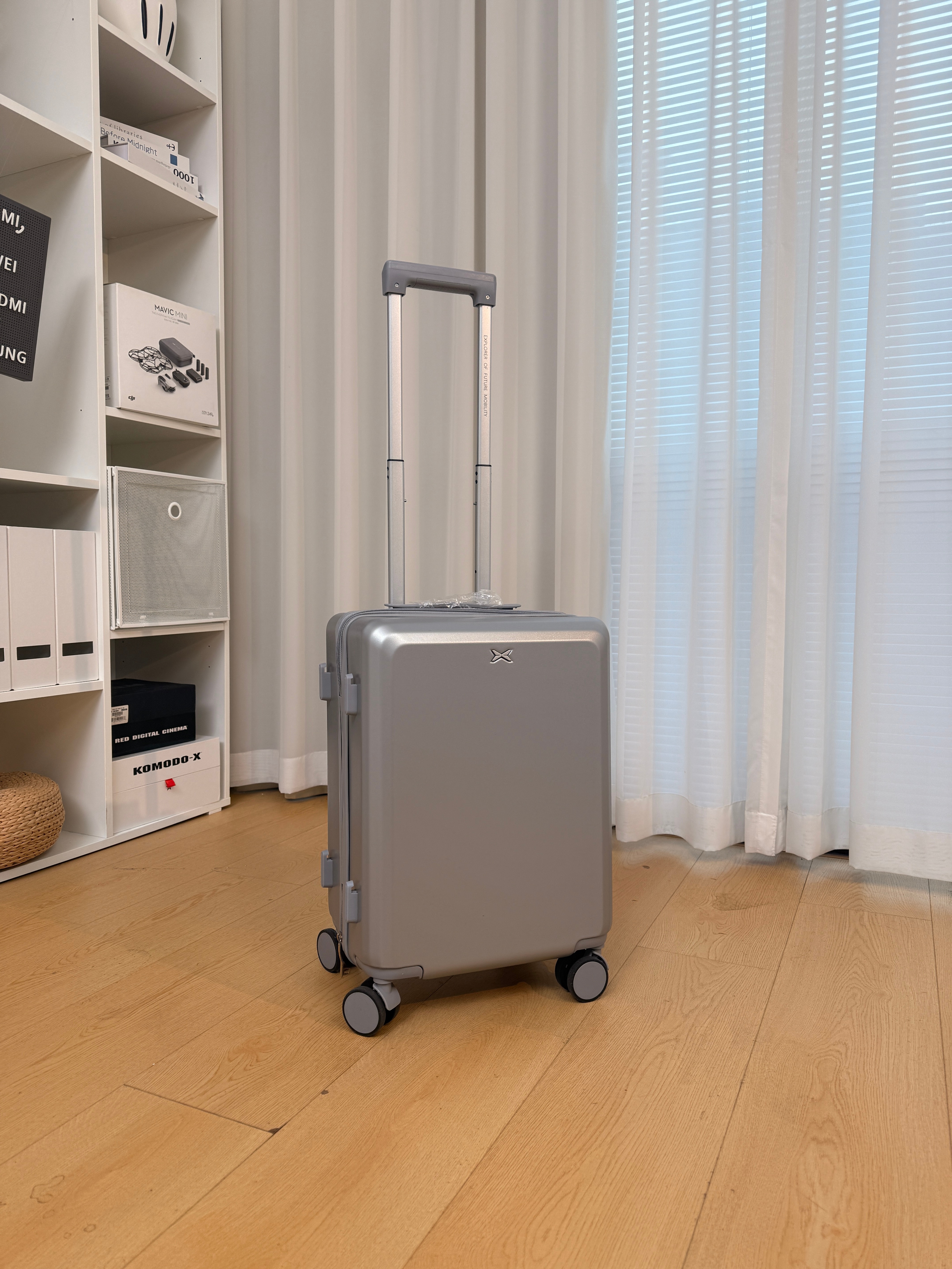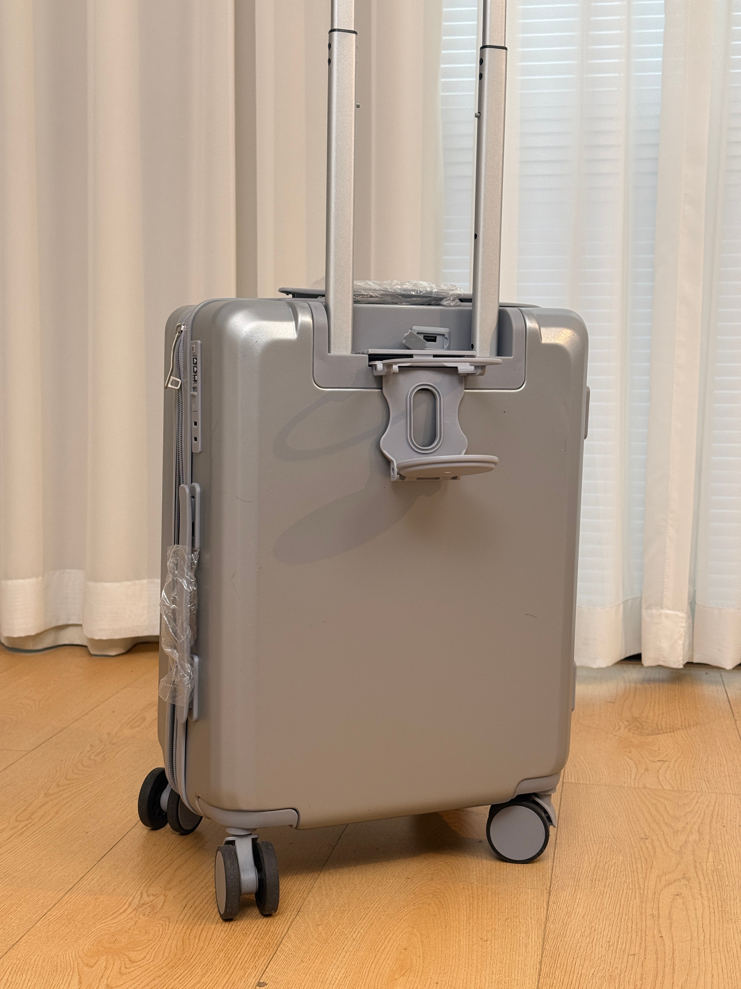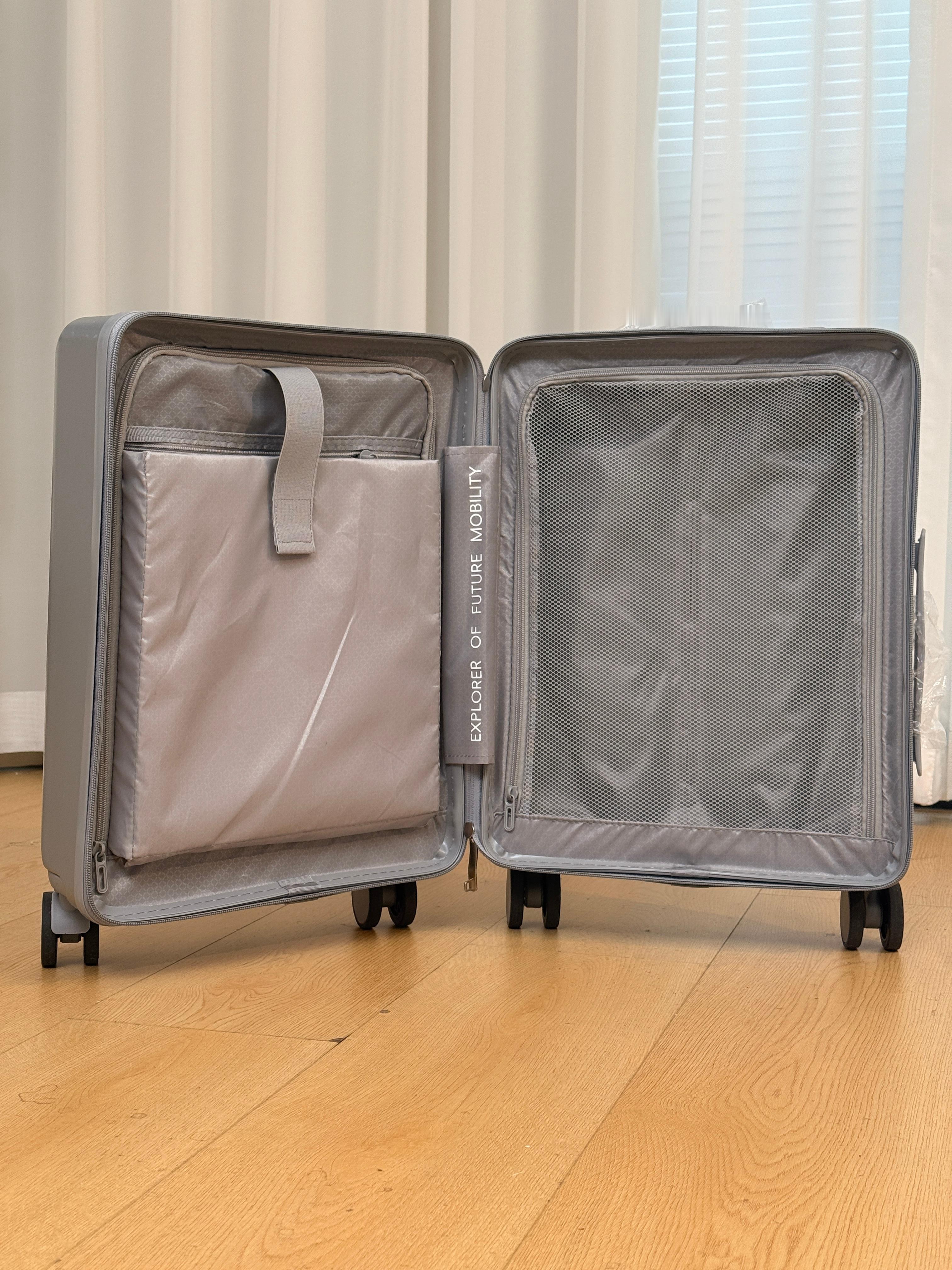 收到了小鹏的新年礼物18寸登机箱上面还有充电口和杯架这个银色和我们P7的新月银一