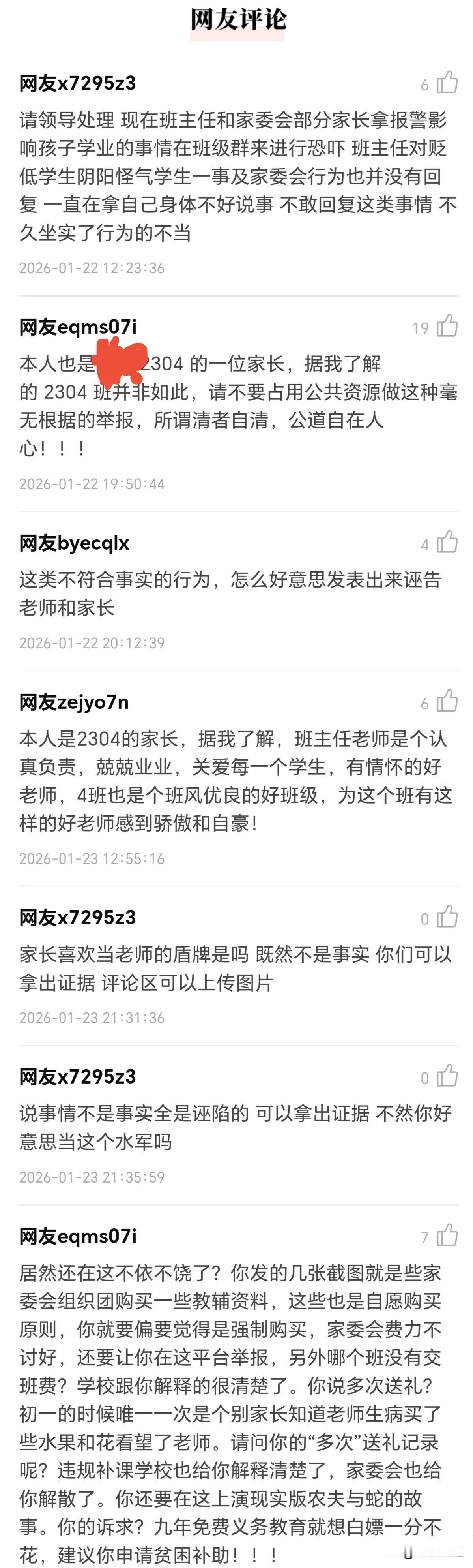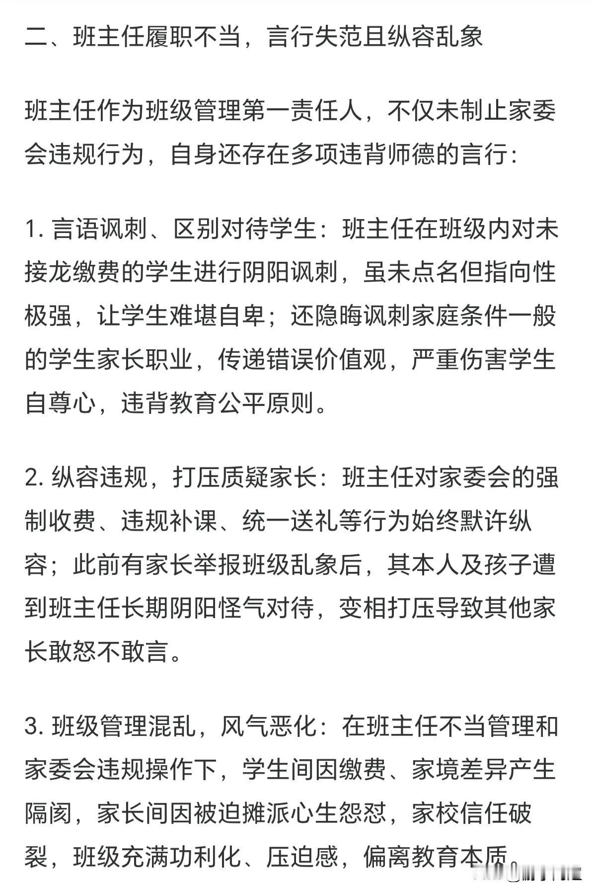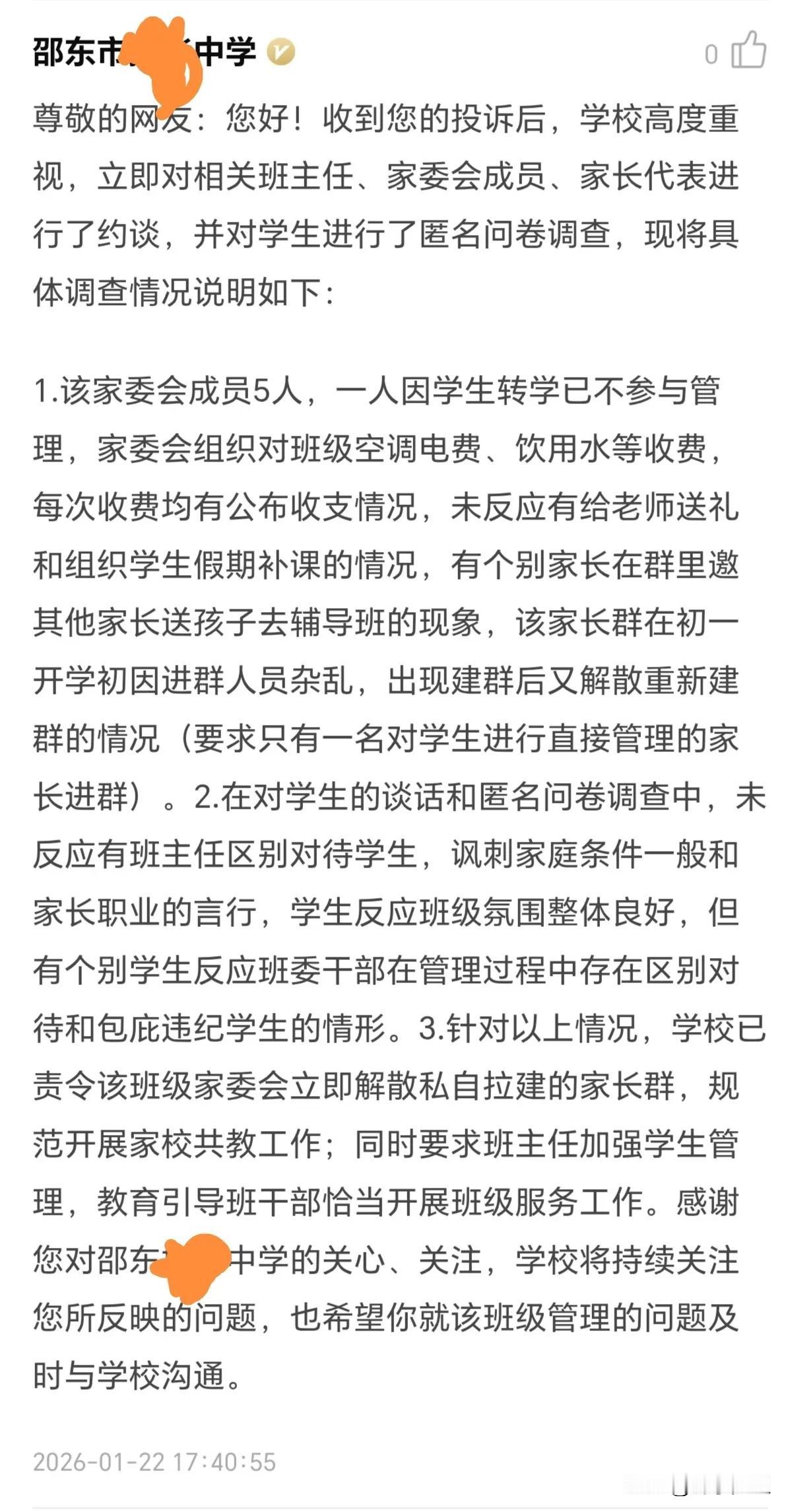 近日,一位家长在问政平台投诉邵东市城区某初中家委会收费乱象问题,校方对此作出了回应。 该家长言词犀利,通过具体事实和截图列举出家委会与班主任存在的不当行为,并明确表达了个人诉求。 家委会存在强制收费频发、以权谋私及压制班级内其他家长合理意见的问题。 班主任严重履职不力,未能有效调解双方矛盾,反而默许家委会的不当行为,其个人言论还对学生造成心理负担。 从相关评论来看,此事有进一步扩大的趋势。 推测引发该家长强烈不满的核心并非收费金额本身,而是家委会未能倾听其他家长的意见,反而采取专横手段进行压制和排斥,导致班级家长群体对立,这充分暴露出家委会的失职。 作为班级直接管理人,班主任应主动介入调解以平息事态,若持续采取消极回避的态度,最终受损的将是全班学生的利益。