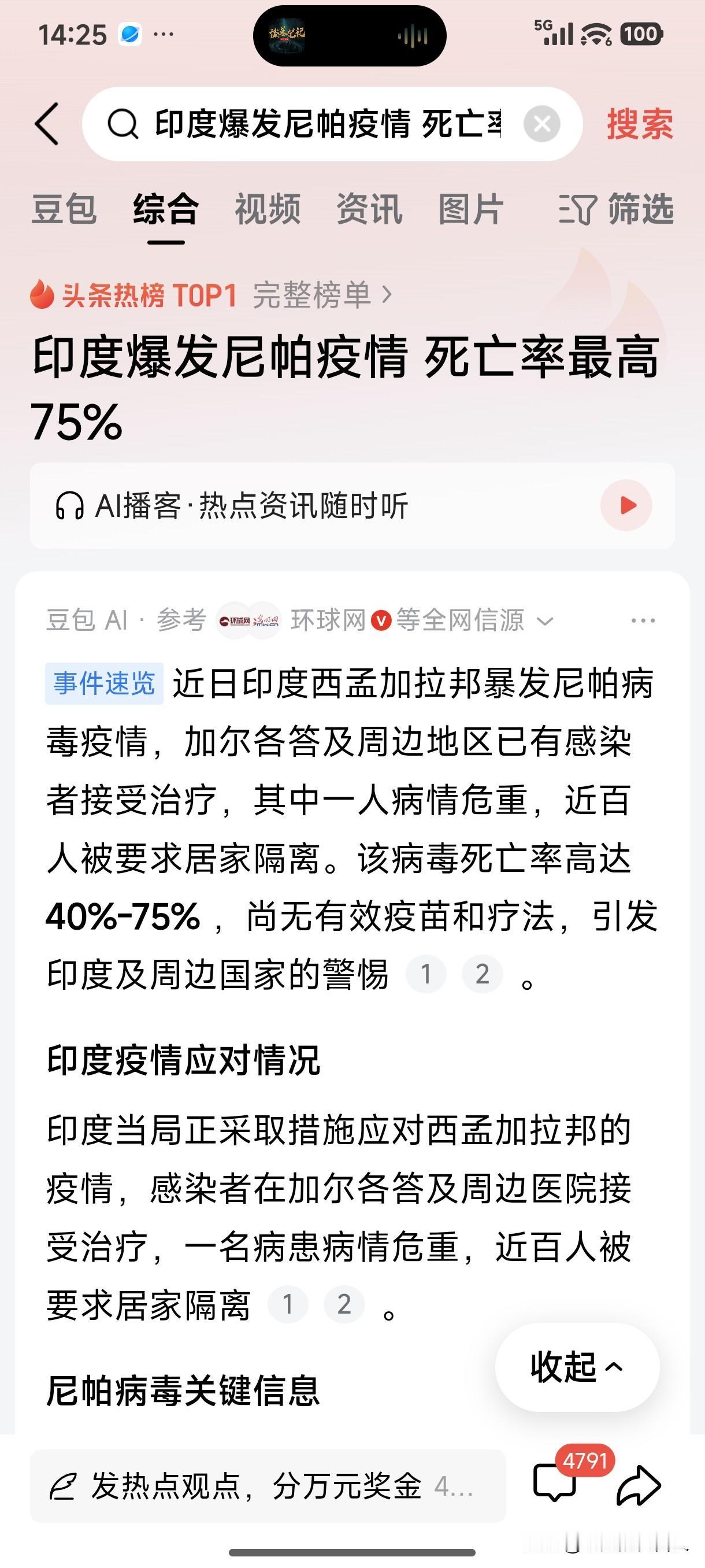 印度疫情暴发世界敲响警钟! 近日印度西孟加拉邦暴发尼帕病毒疫情,加尔各答及周边地区已有感染者接受治疗,其中一人病情危重,近百人被要求居家隔离。该病毒死亡率高达40%-75%,尚无有效疫苗和疗法,引发印度及周边国家的警惕。 疫情三年人们心有余悸,人们还没有完全从疫情的恐惧中缓过来,真的无法再次遭受疫情的祸害了。守住国门第一道关卡太重要了,绝对不能让“病毒”带进国内。正当要“过年”之际,春运正忙时,人流量最大的时候,一定要重视起来认真对待!