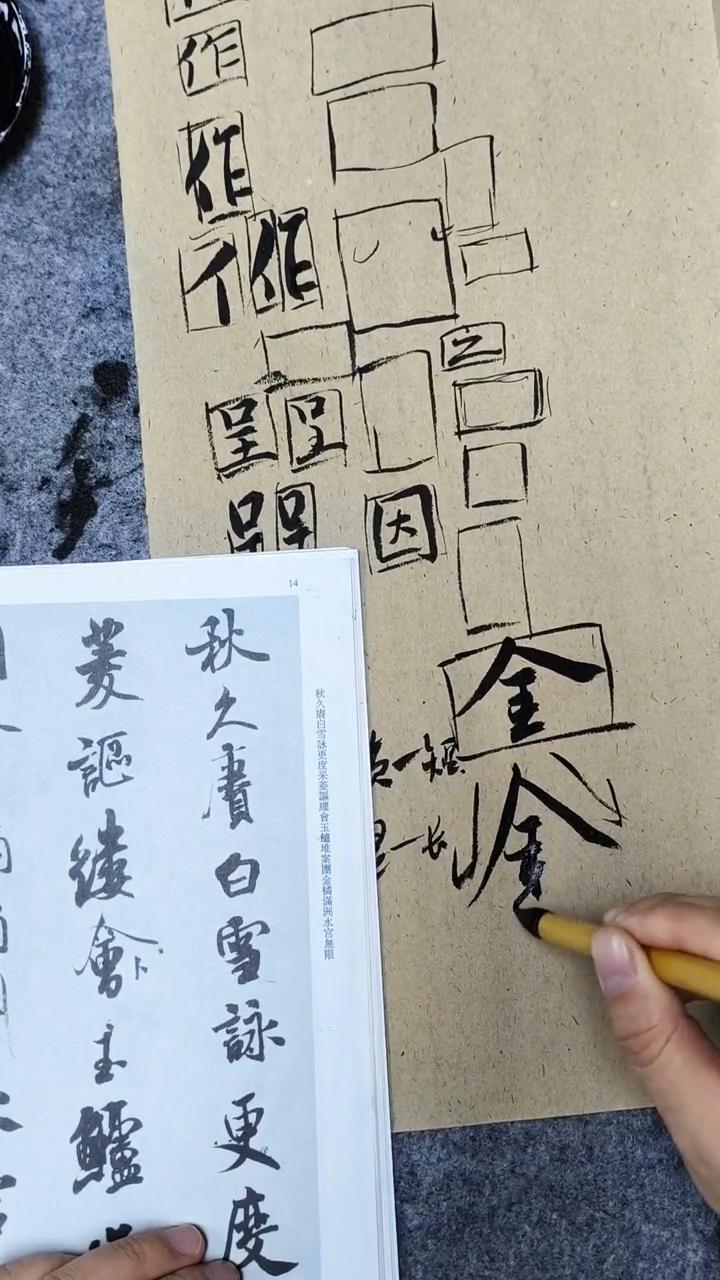 米芾《苕溪诗帖》字势特点第3课。 找一个油皮,他怎么做的比做的重视?好像是铁会比较收敛,那会比较放心。这里就有,你看这个金字,这个金字其实就是平常写这种经络,就是撇捺打开,就是偏向于这种扁的字。 米芾这里做纵向的时候把撇捺撇画往下写,很斜的,把这个整个字就形成一个中相的写法,包括这个灰字其实是一样,包括这个更字其实也是一样的。平常去写都可能就是撇画打开,就是一个纵向的、横向的。米芾这边写的时候就把这种拉下来了,就变成一个纵向的这种式。