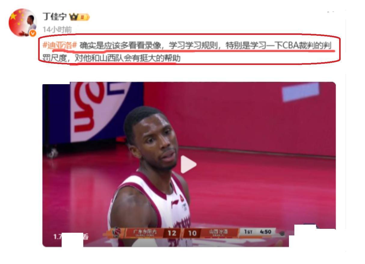 CBA裁判专家,给迪亚洛和山西队提建议! 山西队外援迪亚洛,在近段时间,可以说是引起了非常大的争议,特别是他与广东队的比赛结束之后,更是遭到了很多球迷吐槽,甚至,有一些球员,在他的个人网络平台下,进行各种吐槽。 至于迪亚洛,为何会受到球迷如此对待,可以说,也是事出有因,一方面,他在与广东队的比赛中,导致多名广东队球员受伤,同时,他撞击对手之后,他还显得十分无辜,行为十分恶劣。另一方面,在比赛中,他还多次对现场球迷进行挑衅,导致双方意见更大。 值得一提的是,针对迪亚洛对现场球迷、对当值裁判员做出的一些不良行为,CBA公司也是进行了调查,并且,认定迪亚洛的行为是“侮辱性手势”,因此,根据相关规则,对他进行了罚款30000元的处罚。同时,也对球队负责人潘江,也是罚款10000元。显然,迪亚洛为自己的不良行为买单。 有意思的是,CBA裁判专家丁佳宁,看到迪亚洛在场上的一些小动作,也是给他提出了一个建议,没错,那就是建议迪亚洛,有时间多看一看录像,学习一下CBA规则,特别要认真学习一个CBA裁判的判罚尺度!如此一来,对他本人而言,对山西队而言,都将会有一个非常大的帮助。 作为一名篮球裁判员,丁佳宁可以说是以专注的眼光去给迪亚洛建议,希望他能够专注篮球,打好篮球,少一些不规范的动作。这一方面,是为他个人好,可以帮助他在比赛中有更加出色的表现。另一方面,也是给山西队减少一些负面的影响,毕竟,网上传迪亚洛是CBA打球最脏的球员,这样的名声,可是不好听呀。 因此,笔者也是建议山西队方面和迪亚洛本人,都是听一听丁佳宁的建议,好好学习一下CBA的规则,好好学习一下CBA裁判的吹罚尺度。 迪亚洛作为一名身体素质优秀球员,作为一个有激情的球员,作为一个热爱篮球的球员,作为一个有目标有理想的球员,难道不想自己变得更加优秀吗?正所谓想做好事,先做好人,不就是这个意思吗?