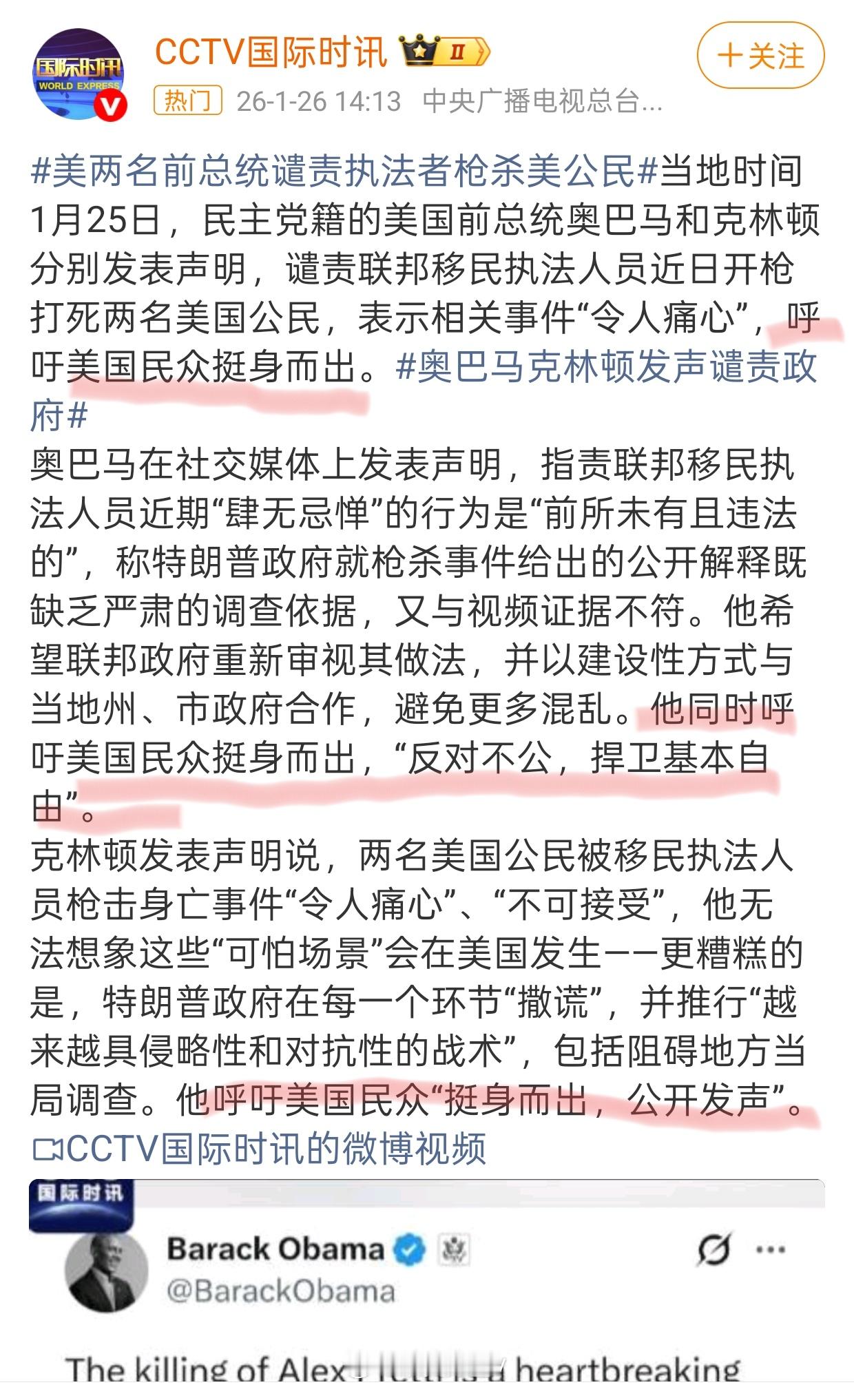 美两名前总统谴责执法者枪杀美公民克林顿和奥巴马都呼吁“美国民众挺身而出”了,可惜民主党还是太怂了,还是忽悠老百姓上,不敢自己先上。这就是战争时期“兄弟们跟我上”和“兄弟们给我上”的区别,虽然看上去只有一字之别,但是结果却是不日而语的。民主党也不行啊克林顿奥巴马发声热点观点
