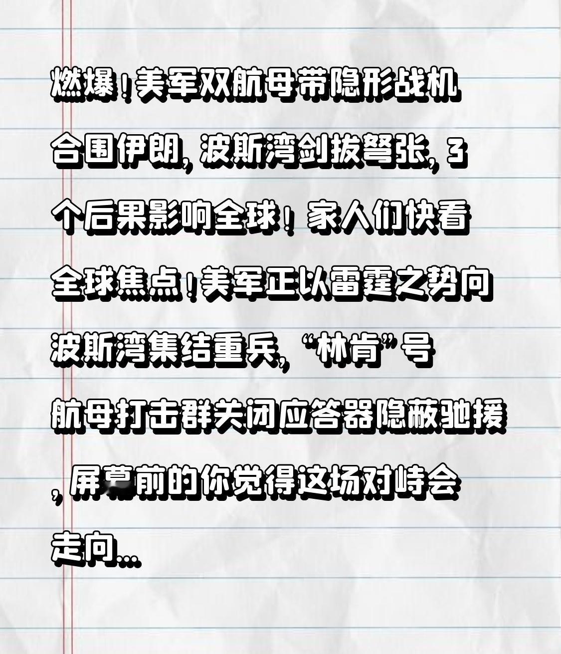 燃爆!美军双航母带隐形战机合围伊朗,波斯湾剑拔弩张,3个后果影响全球! 家人们快看全球焦点!美军正以雷霆之势向波斯湾集结重兵,“林肯”号航母打击群关闭应答器隐蔽驰援,搭载着F-35C隐形战机和数十枚“战斧”巡航导弹,加上早已部署的“罗斯福”号航母、12架F-15E战斗轰炸机,还有“萨德”反导系统筑牢防线,对伊朗形成合围之势!特朗普直言“庞大舰队正朝那个方向驶去”,中东火药桶一触即发! 可能有人觉得“打仗是大国的事,跟我们没关系”,但这次局势远比想象中危险!美军不仅有双航母压阵,还有“弗吉尼亚”级核潜艇潜伏水下,宙斯盾驱逐舰随时能发射射程2500公里的巡航导弹,连英国都派“台风”战机助阵,摆出了随时开战的架势。而伊朗的回应更硬核,革命卫队进入最高战备,南部沿海部署40枚15马赫的“法塔赫-2”高超音速导弹,直言“任何攻击都将视为全面战争”! 转折点来了!这场对峙根本不是“谁能打赢”的问题,而是一旦开打,3个连锁后果将冲击每个普通人!首先是能源危机,伊朗掌控着霍尔木兹海峡,全球30%的石油要从这里过,一旦封锁,国际油价可能飙到150美元/桶,国内油价、物价都会跟着暴涨;其次是地区大乱,黎巴嫩真主党13万枚火箭弹、也门胡塞武装的反舰导弹都会被激活,美军将陷入多线作战;更要命的是核风险升级,伊朗可能加速推进核计划,让中东彻底陷入核阴影。 更让人意外的是美国盟友的态度,沙特、卡塔尔等海湾国家直接宣布中立,拒绝美军使用其基地,显然不想被拖入战争。而伊朗也没坐以待毙,一边用加密货币突破制裁,一边和俄罗斯深化军事合作,形成了“非对称反击”的格局。美军看似兵强马壮,但面对伊朗的导弹和代理武装,根本没把握打赢一场“速战速决”的战争。 其实这场危机的核心,是单边施压与强硬反制的恶性循环。美国的制裁已经让伊朗民生凋敝,食品价格涨72%,30%常用药断供,但极限施压不仅没让伊朗屈服,反而让局势更紧张。而对我们普通人来说,油价上涨、全球通胀加剧,都是可能直接面临的影响,和平从来不是理所当然,而是需要各方克制守护。 从伊拉克战争到叙利亚冲突,历史早已证明,战争没有赢家,只会带来无尽的苦难。现在联合国呼吁通过外交解决,中国也坚持反对使用武力,毕竟靠拳头解决问题,最终只会两败俱伤。 屏幕前的你觉得这场对峙会走向战争吗?你担心油价上涨影响生活吗?评论区聊聊你的看法,点赞转发,让更多人关注这场关乎全球稳定的危机,愿世界少点冲突,多点和平!记住,大国博弈的背后,每个普通人都可能被波及,珍惜和平,才是最珍贵的福祉!