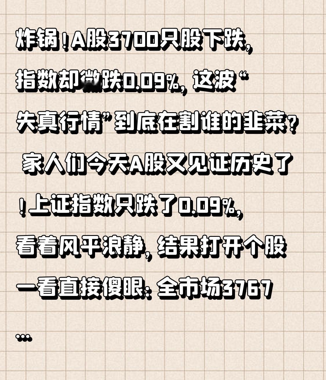 炸锅!A股3700只股下跌,指数却微跌0.09%,这波“失真行情”到底在割谁的韭菜? 家人们今天A股又见证历史了!上证指数只跌了0.09%,看着风平浪静,结果打开个股一看直接傻眼:全市场3767只股票下跌,只有1602只上涨,超七成股民亏钱,有人满仓亏了15%,有人自嘲“指数在ICU外蹦迪,我的股票在ICU里抢救”!这诡异的“指数稳、个股崩”到底是怎么回事? 很多人以为是自己运气差,选错了股票,其实背后藏着大猫腻!这就是关键转折点:当前A股的核心矛盾,是中特估大盘股的“流动性虹吸效应”——银行、保险、煤炭这些权重股集体护盘,硬生生把指数撑住了,可它们吸走了市场大部分资金,导致中小盘股彻底失血,只能集体下跌。简单说就是“少数权重吃肉,多数个股喝汤都没份”,形成了极致分化的“冰火两重天”。 更让人揪心的是,这场景跟1月20日一模一样!当时也是权重拉升、个股普跌,最后引发了一波回调,现在历史又在重演。今天唯一的亮点只有黄金板块,湖南黄金、山东黄金等多只个股涨停,毕竟国际金价突破5000美元/盎司,避险资金只能扎堆往黄金里钻。而前期热门的AI、半导体、商业航天等题材股全在跌,中国卫星、航天电子直接跌停,不少追高的股民被深度套牢。 可能有人会问:为啥资金非要盯着中特估?答案很现实:春节前增量资金有限,大家都在找“避风港”。中特估有政策支持,还能高分红,估值又低,自然成了资金的首选。但这种“单极吸金”模式,就像把水池里的水全抽到一个地方,其他地方只能干涸,中小盘股没人接盘,只能越跌越狠。 但大家也别慌,这3个信号能帮你判断后市:第一看成交量,如果后续成交额能维持在2.5万亿以上,中小盘股可能会轮动修复;第二看政策,要是国资委再出央企市值管理细则,中特估可能还会强;第三看板块轮动,要是光伏、AI能止跌,市场情绪才会真好转。操作上建议别重仓跟风,把仓位控制在50%以下,回调到位的优质中小盘股可以分批低吸,涨多的热门股赶紧减仓锁定利润。 其实A股这波震荡,本质是“盈利驱动”取代了“估值修复”,资金不再为纯概念买单,而是盯着有业绩支撑的标的。对普通股民来说,最忌讳的就是被指数骗了,盲目抄底或追高。记住,指数只是门面,个股的真实走势才关乎你的钱包。 屏幕前的你今天亏了还是赚了?手里的股票是在“护盘大军”里,还是被虹吸的中小盘股?评论区聊聊你的经历,想知道具体哪些板块有机会的,点赞转发,关注我下期详解,一起在震荡市中避坑赚钱!记住,股市里保住本金,比啥都重要!