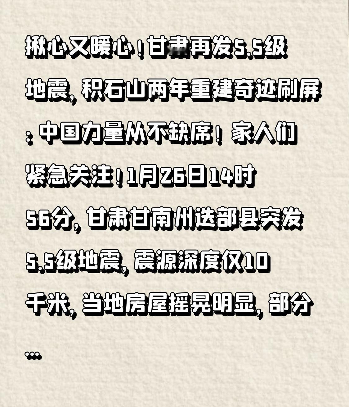 揪心又暖心!甘肃再发5.5级地震,积石山两年重建奇迹刷屏:中国力量从不缺席! 家人们紧急关注!1月26日14时56分,甘肃甘南州迭部县突发5.5级地震,震源深度仅10千米,当地房屋摇晃明显,部分老旧建筑出现裂缝,万幸目前暂无人员伤亡报告!而就在一年多前,临夏州积石山县6.2级地震的伤痛还未完全消散,如今甘肃再遇震情,牵动着全国人民的心! 可能很多人还清晰记得,2023年12月18日积石山地震的惨烈:6.2级强震瞬间摧毁家园,泥流掩埋65栋房屋,淤泥最深达5米,寒冷与余震交织,救援难度超乎想象。震后第一时间,中国安能集团396名救援队员从6省9地千里驰援,带着189台重型装备昼夜兼程,24小时不间断清淤搜救,挖掘机操作手顶着零下低温,每天高强度工作12小时,反复抖动铲斗筛查幸存者,用专业与坚守创造了生命奇迹。 而最让人动容的,是灾难后的重生力量!就在大家担心灾区恢复进度时,转折点来了:积石山灾后重建实现“三年任务两年完成”的惊人目标,271个重建项目全部完工,完工率100%!仅用6个月就完成所有居民住房重建,70多天修好209所学校,5个月内21所新建学校投用,孩子们如期回到课堂;交通、水利、能源设施全面提档升级,灾区生活水平不仅恢复,更超过灾前水平,这就是震撼世界的“甘肃速度”。 这背后,是无数人的坚守与付出:央企国企冲锋在前,承担安置房建设等关键任务;专业技术团队全程把控质量,确保所有建筑符合抗震标准;灾区群众不等不靠,主动投身重建,用双手重建家园。社会各界的爱心也从未缺席,捐款捐物源源不断,志愿者们扎根一线,让寒冬里的灾区充满暖意。 如今迭部县再发地震,我们看到的不仅是警惕,更有底气:完善的应急响应机制、专业的救援力量、成熟的重建经验,让我们有信心应对一切挑战。从积石山的废墟重生,到迭部的平稳应对,一次次灾难面前,中国人民总能拧成一股绳,用团结与坚韧战胜困难。 其实灾难从来不能打败我们,只会让我们更加强大。积石山的崭新家园、孩子们的朗朗书声、群众脸上的笑容,都在诉说着:只要我们心往一处想、劲往一处使,就没有跨不过的坎,没有扛不住的难。 屏幕前的你,是否为积石山的重建奇迹感动?是否想为甘肃迭部送上祝福?评论区留下你的祈愿,点赞转发,让更多人看到中国力量的温暖与坚韧!愿甘肃平安,愿每一份坚守都有回响,每一个家园都能安然无恙!