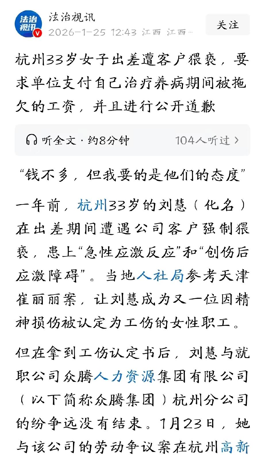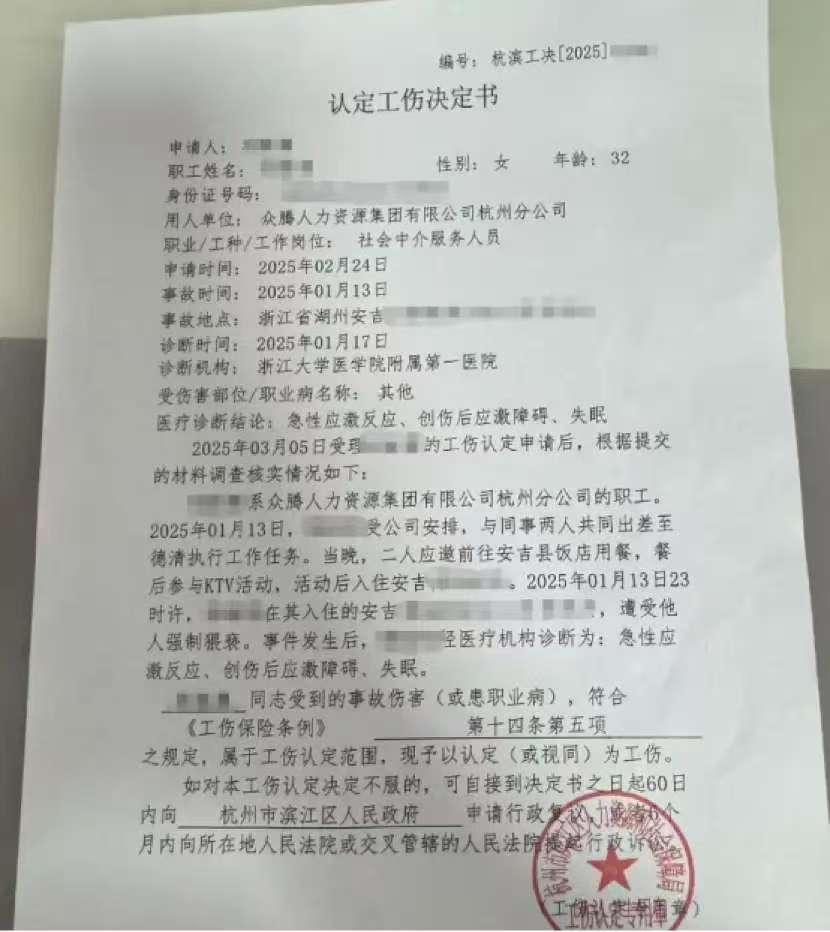 浙江杭州,33岁女员工出差期间,陪客户喝酒唱歌,半夜回到房间,睡得迷迷糊糊时,突然感觉有人在摸她,惊醒后竟发现是公司的男客户。女子因此失眠恐惧,患上“创伤后应激障碍”。事后,她申请了工伤认定,并希望公司公开道歉并赔偿2万余元。谁知,公司不仅没给予赔偿,还建议她主动辞职。女子一怒之下提起了劳动仲裁。 33岁的女子刘慧是某公司的一名员工,她年轻漂亮,工作能力也很强。 2025年1月13日,她刚入职五个多月,就被公司派到外地出差。当晚,她和总经理万某与客户金某等人一起吃饭,席间喝了酒。 饭后,客户金某热情挽留,为他们开了酒店房间,又邀请去KTV唱歌。刘慧本不想去,但领导都同意了,她只能跟着去。 夜里十一点多,已经在酒店房间睡着的刘慧,迷迷糊糊中感觉有人在碰她。 她猛地惊醒,发现身边躺着一个没穿衣服的男人,正是客户金某。 刘慧吓得心都要跳出来了,慌忙躲进卫生间,金某待了几分钟后离开,走前还说“不用怕”,甚至说可以报警。 惊魂未定的刘慧选择了报警。事后判决书认定,金某在前台拿了刘慧房间的房卡进去,趁她酒后睡着实施了猥亵。 最终,金某因强制猥亵罪被判刑,但事情对刘慧的影响远未结束。 事发第五天,她就去看了精神科,医生诊断她出现了“急性应激反应”。 接下来的一个月,情况没有好转,她持续失眠、恐惧,无法集中精神,被进一步确诊为“创伤后应激障碍”。 那段时间,她心里全是委屈和后怕,完全无法正常工作和生活。 请假休养一个月后,公司领导通知她复工,可刘慧的状态仍然很差,根本没法上班。 领导得知后,反而建议她“主动辞职”。刘慧拒绝了,她认为公司应该按正规流程处理。 当她拿着医院的病假条再次申请休假时,公司没有批准。 陷入无助的刘慧,在2025年3月初将自己的经历发到了网上,立刻引起了关注。 公司的态度随之转变,很快批了病假,一位高管还专程来杭州当面道歉,并转账了10万元,希望协商解决。 但刘慧觉得,公司只是怕影响不好,并非真心认识到错误,沟通中她感到很不舒服。 她公开表示,除了法律规定的赔偿,不会多拿公司一分钱。 协商僵住了,病还得治,刘慧持续提交病假申请。 但从2025年6月开始,公司以“3个月医疗期已满”且工伤认定结果还没出来为由,不再批她的病假,只按事假处理。 公司说,如果最后认定是工伤,会补上待遇差额。 就在与公司拉锯期间,刘慧参考了之前天津类似的崔丽丽案例,为自己申请了工伤认定。 2025年9月11日,她成功拿到了《认定工伤决定书》,人社局认定她因工作期间遭受暴力伤害导致的精神损伤属于工伤。 本以为事情有了转机,但当她回头和公司谈“停工留薪期”工资待遇时,分歧又出现了。 公司出具文件,将她的停工留薪期暂定为事发日至6月30日,共5.5个月,并承诺会补发这期间的工资。 但刘慧认为,根据规定和她的病情,停工留薪期应该到她康复或法定期限届满为止。 公司的态度让她倍感压力,本来稍有好转的情绪又变得糟糕起来。 之后,公司曾催促她去做劳动能力鉴定。10月的结果显示“未构级”,即没有伤残等级。 社保方面的解释是,对于精神类伤害,现有规定确实很难评上等级,但如果确实无法上班,还是得看医疗诊断。 这个结果让事情变得更复杂,沟通无果,刘慧在2025年12月提起了劳动仲裁。 她要求公司公开道歉,并支付她2025年7月至12月被拖欠的工资、医疗费等,总计两万多元。 在她心里,钱不是最重要的,她更想要公司一个真诚认错的态度。 2026年1月23日,仲裁案开庭,公司方坚持认为,她的停工留薪期早在去年6月就已结束,之后的假期属于事假,并称其当前病情与工伤无关。 但因为种种原因,案件没有当庭裁决。 从遭遇伤害,到确诊疾病,再到认定工伤,最后对簿公堂,这一年对刘慧来说格外漫长。 她仍在休病假,仍在等待一个最终的结果,也仍在等待那句她认为应有的、正式的道歉。